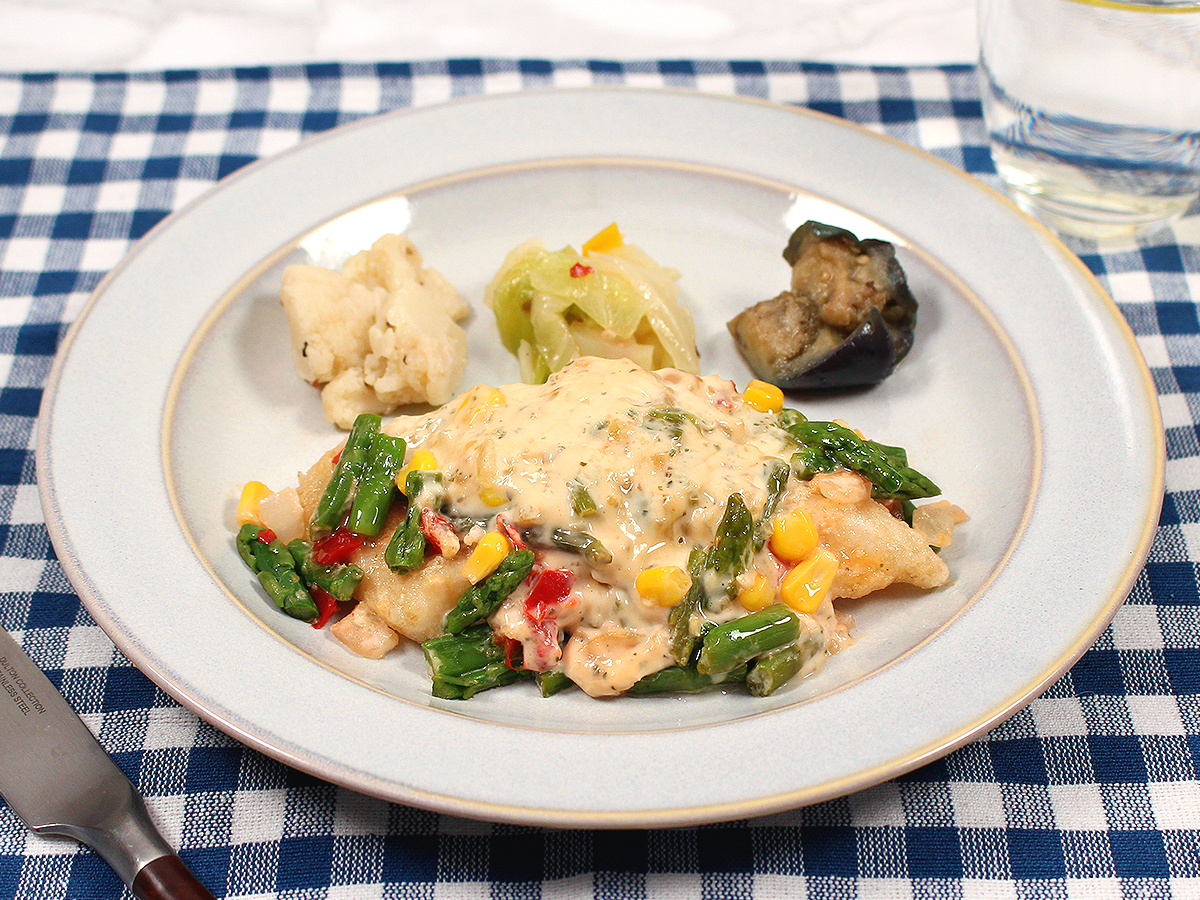 人気の味はそのまま、カラフルな野菜のトッピングを増やし、彩りも一段と美しく仕上げました。白身魚にタルタルソースをたっぷりとのせて、豪快にほおばってほしい一品です。