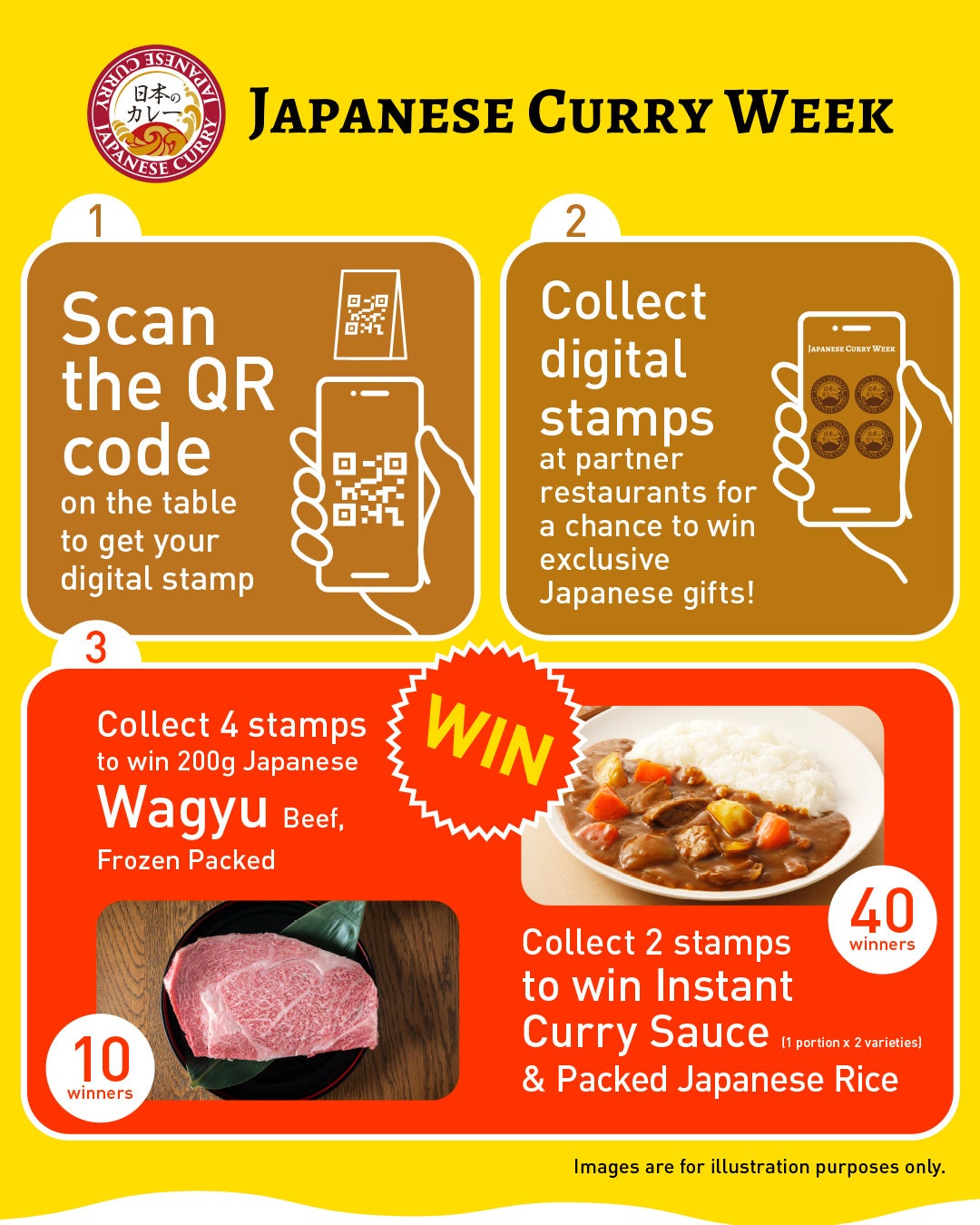 実施期間中、掲示ポスターに記載されている参加用QRコードをスマートフォンで読み取り、参加登録を行います。参加登録後に対象のレストランを巡り、各店舗に設置されたQRコードを読み取ることで、スタンプが取得できます。スタンプを2個集めると『レトルトカレー』と『日本米』のセット、4個集めると『和牛』が当たる抽選に応募いただけます。