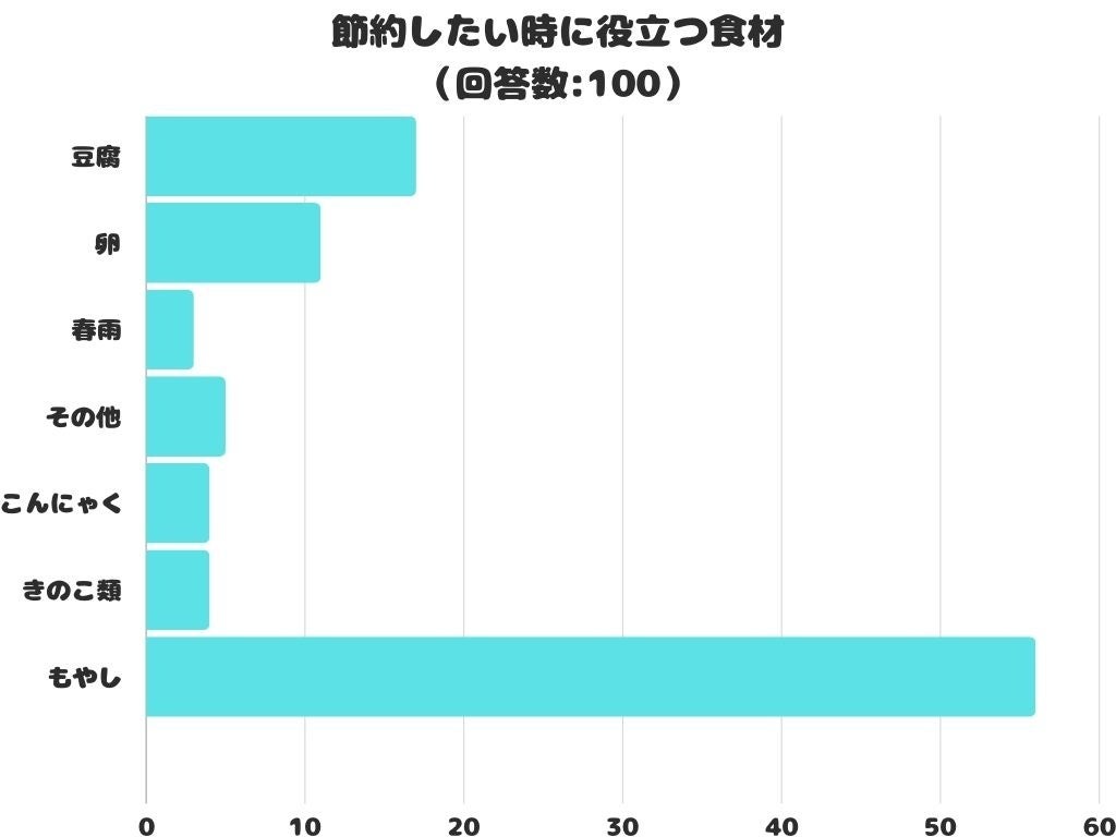 「節約したい時に役立つ食材」をアンケートにて調査したところ、1位は「もやし」でした。