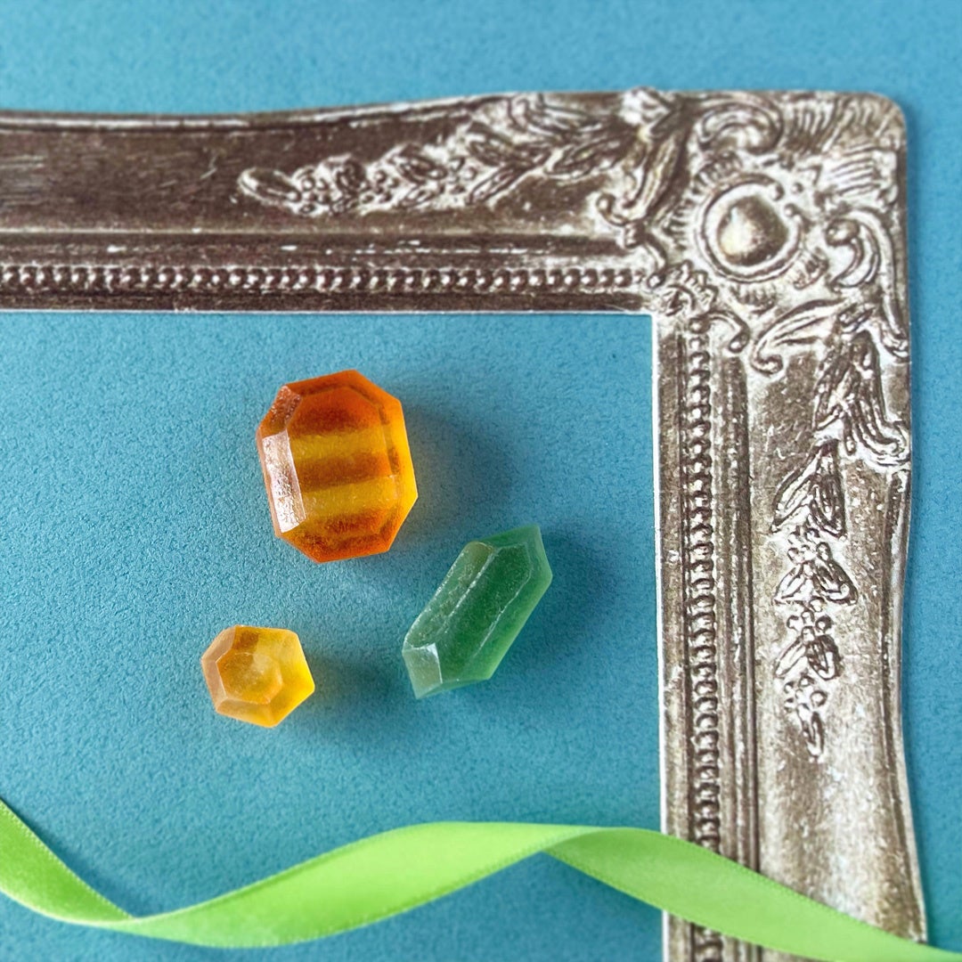 ひと際大きいこうぶつヲカシは宝石としても人気の高いグリーンのペリドット原石をモチーフに、暑い夏に爽やかな草原を思わせる涼やかさを。縞模様が綺麗な瑪瑙(めのう)の一種サードニクスは夏味のマンゴー&ライチ味です。見た目だけでなく、美味しさにもこだわり作りました。
