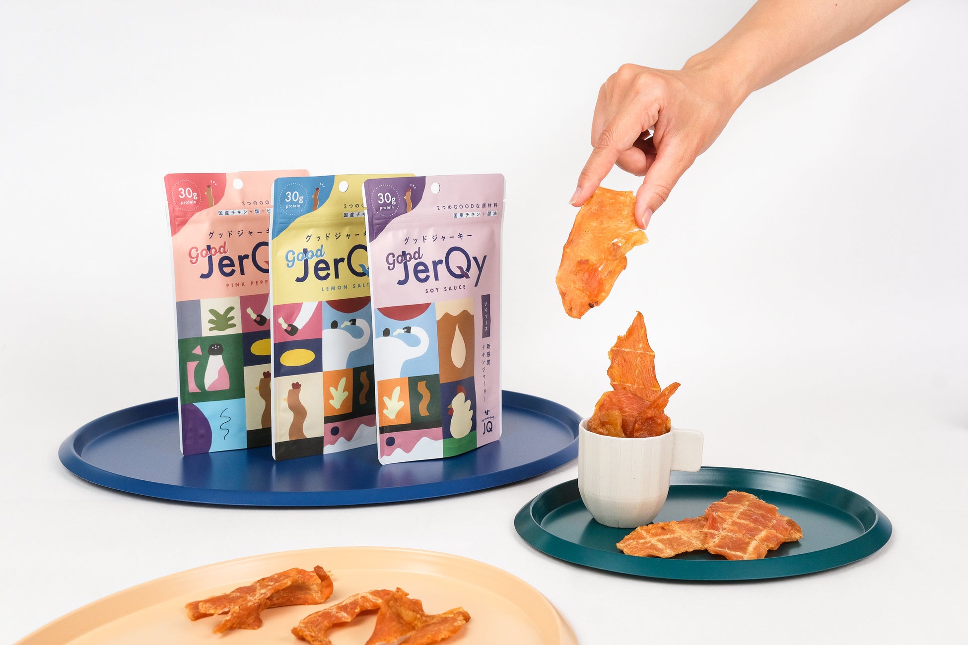 化学調味料などの添加物を一切使わず、国産の鶏肉とわずかな調味料(お醤油や塩こしょうなど)だけで味つけした無添加チキンジャーキー「good JerQy(グッドジャーキー)」