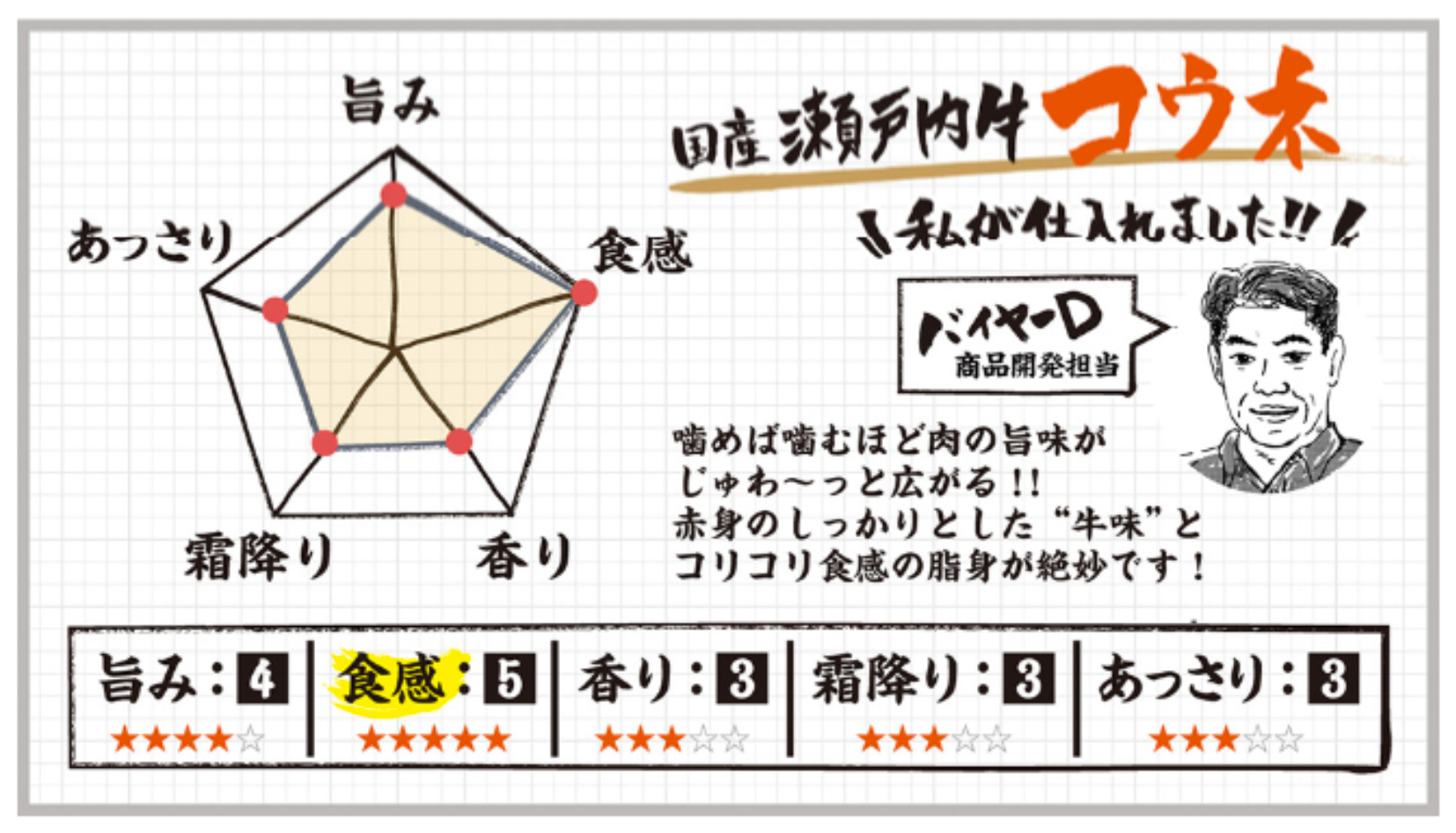 【旨み…4】脂身は想像以上に甘くとろける味わい。また赤身の濃い味わいとのバランスがよく一度食べたらクセになるおいしさです。