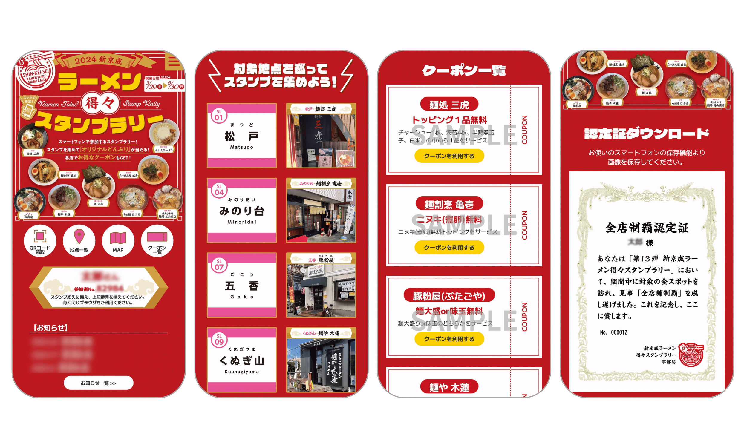参加者は実施期間中に対象の駅やラーメン店を巡り、各所に設置されている地点ポスターからQRコードを読み取ることでスタンプを取得します。ラーメン店でスタンプを取得すると、「トッピング一品無料」や「麺大盛無料」など、その店の独自の特典クーポンもあわせて獲得できます。