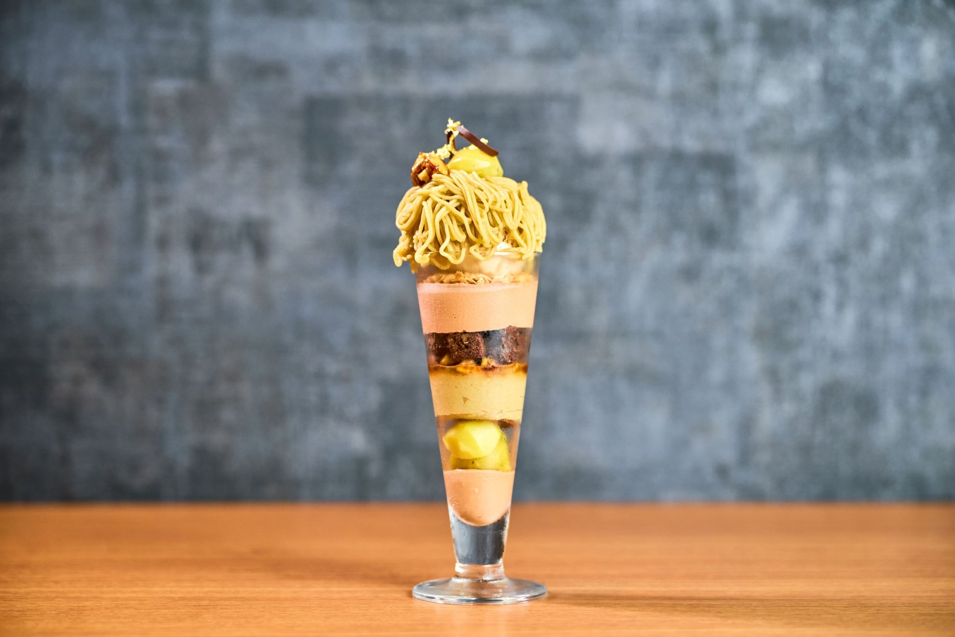 実りの秋の代名詞、栗をふんだんに用い、栗と相性の良いショコラを組み合わせた、深まる秋を感じられるパフェが登場。上品な甘さのショコラムースの上に、何度も試作を繰り返し、絶妙な甘みとほっくりとした食感に仕上げた自家製マロングラッセを敷き詰めました。なめらかなマロングラッセのアイスの上には、ご注文を受けてから絞るふわふわのマロンペーストを。口に入れた瞬間、ほどけるようなやわらかさで、あえて粗めに挽くことで甘みとコクを最大限に引き出しています。程よくビターなショコラが全体を引き締め、栗の甘みと調和。食べ進むごとに移り変わる秋の味覚がご堪能いただけます。