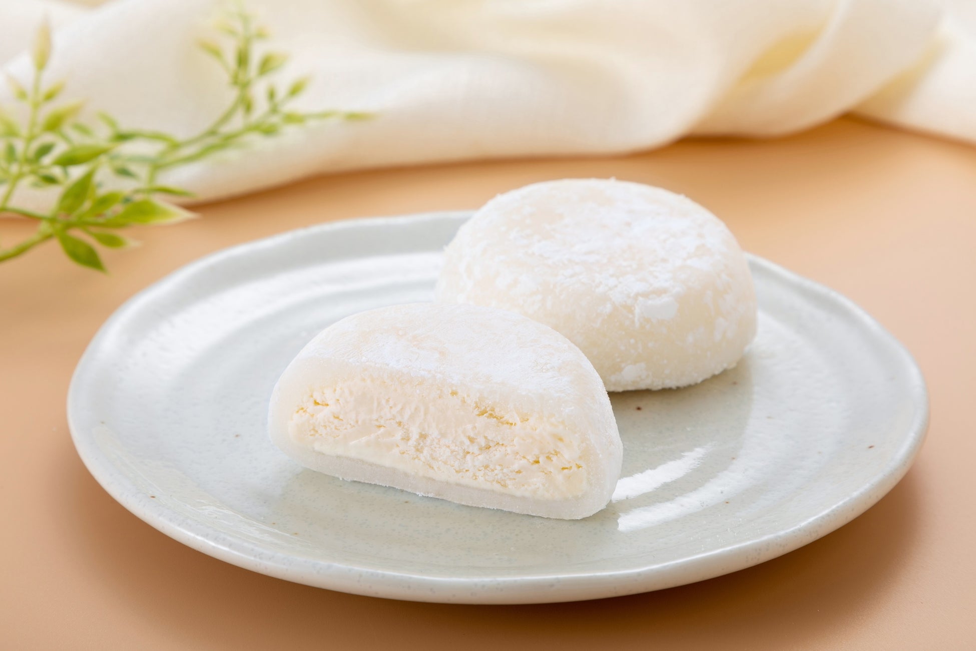 卵を使用せず「蒜山ジャージー®牛乳」をたっぷり使用した、特製ミルククリームを富山県産のブランド米、新大正もち米を使用したもち粉とメレンゲを合わせた、なめらかな求肥で包みました。