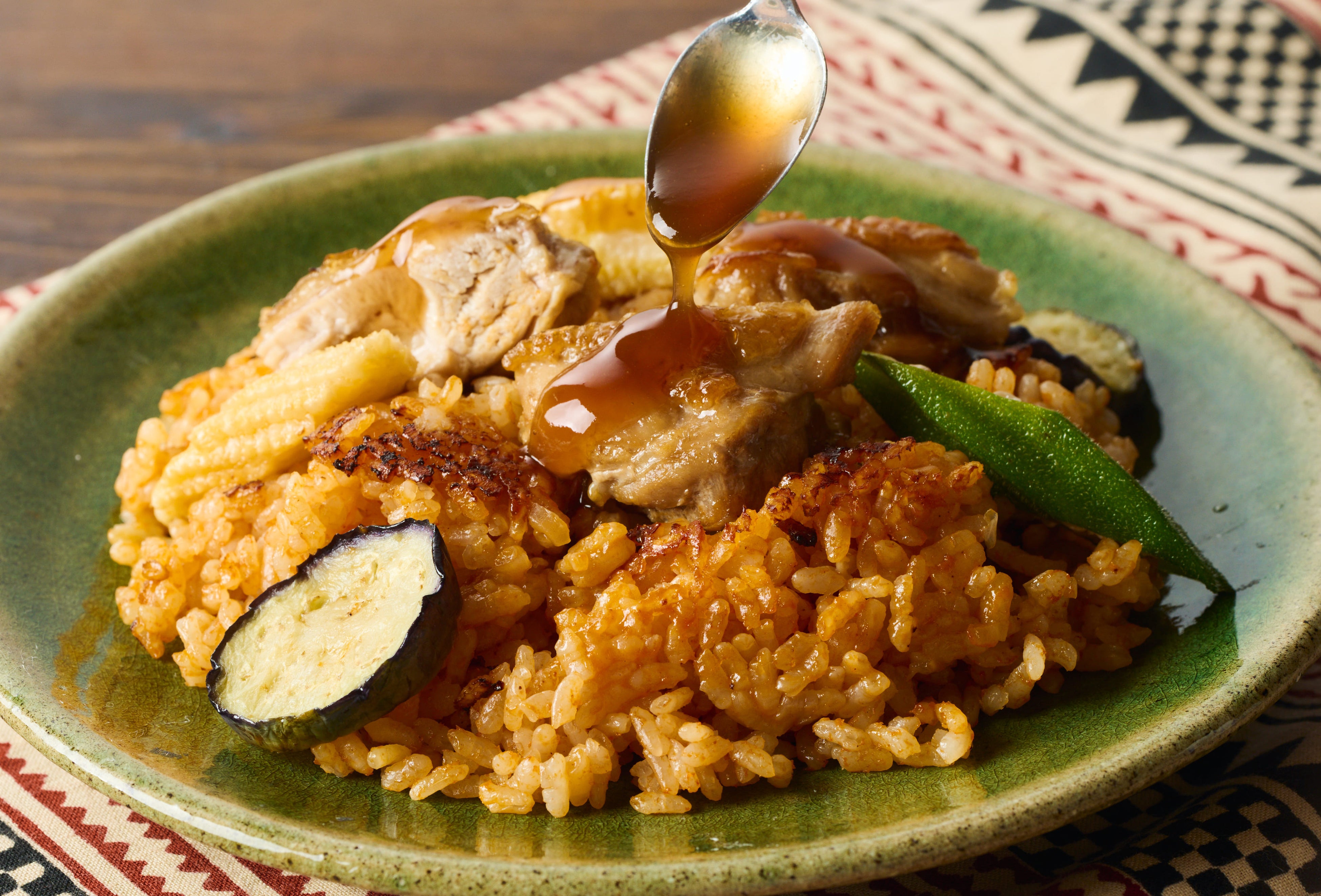 商品詳細 :パエリアの原型と言われている、ジョロフライス。アフリカの家庭料理で、ご家族みんなで食べるのにぴったりの料理です。野菜ジュースの香味がスパイスとからみ、鶏肉とお米の旨みを引き立てます。