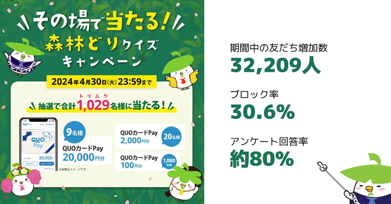 株式会社ウェルファムフーズ様は、主力商品である鶏肉ブランド「森林どり」の認知拡大を目的にLINEクイズキャンペーンを実施。キャンペーン期間を通して公式アカウントの友だちが3万人以上増加し、さらに施策後のブロック率も低く、成果に繋がりました。