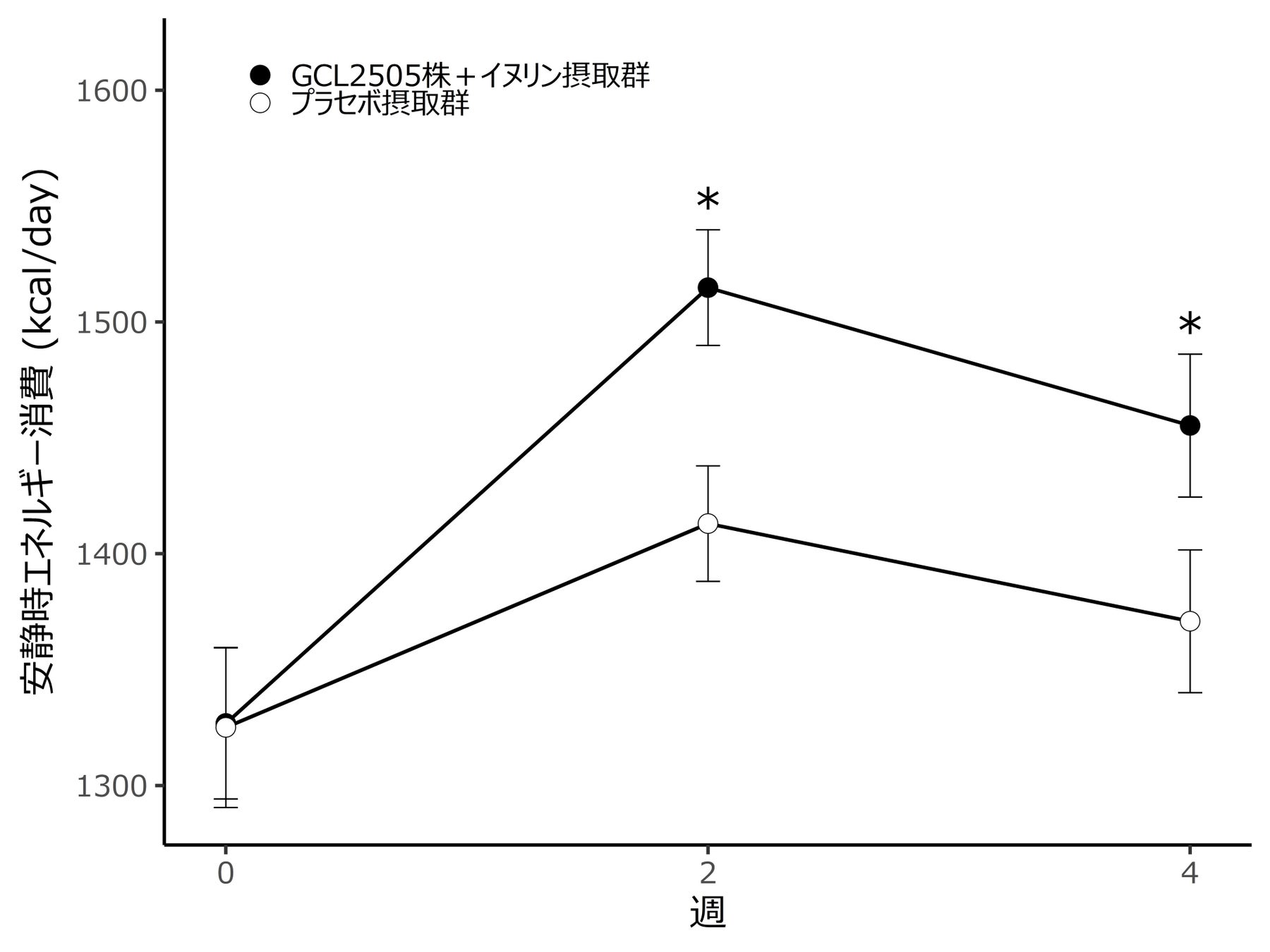 ・その結果、1日あたり100億個のGCL2505株と5gのイヌリンを 4週間摂取した群(GCL2505株+イヌリン摂取群)は、プラセボ群と比較して、間接熱量計で測定した安静時エネルギー消費量が有意に増加しました。4週目における群間差は84.4 kcal/日でした。また、GCL2505株+イヌリン摂取群の糞便中の総ビフィズス菌数は、プラセボ群と比較して有意に高い値を示しました。