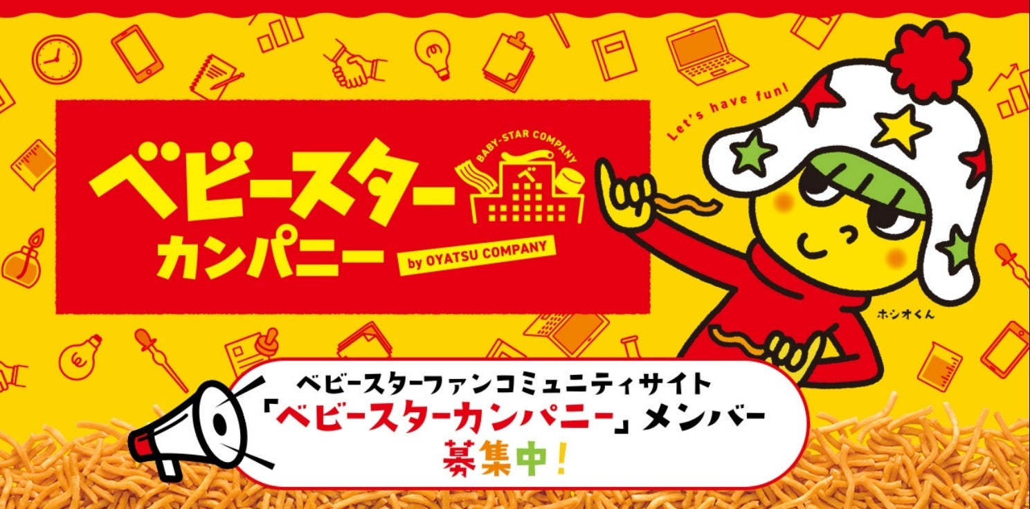 おやつカンパニーは、ファンコミュニティサイト『ベビースターカンパニー』を通して、ファンとの双方向のコミュニケーションを深め、ベビースターファンとともに“もっと楽しい、未来のベビースター”の共創を目指します。