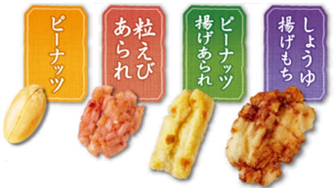 商品特徴:しょうゆ揚げ餅、ピーナッツ揚げあられ、粒えびあられ、ピーナッツをミックスしました。好きな種類を好きな量だけ食べられます。