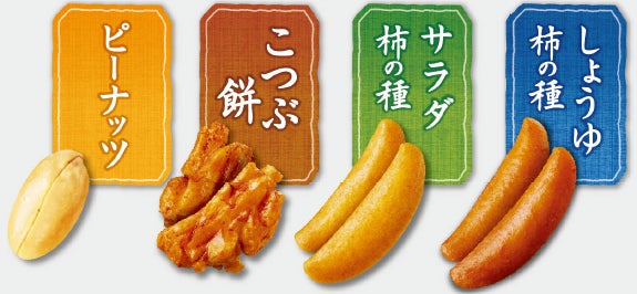 商品特徴:サラダ柿の種、しょうゆ柿の種、こつぶ餅、ピーナッツをミックスしました。好きな種類を好きな量だけ食べられます。おつまみやおやつに。