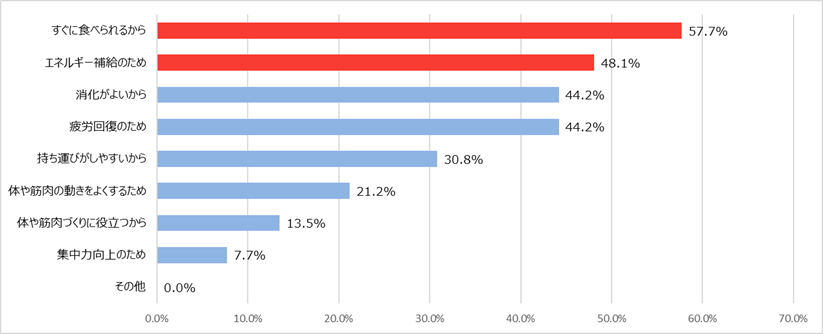 一方で、運動中に「果物」を摂取していると回答している方に、果物の種類を尋ねたところ、「バナナ」を食べている人が最も高く80%となっており(図3)、その理由としては「すぐに食べられるから(57.7%)」「エネルギー補給のため(48.1%)」が上位となり、その手軽さと栄養パフォーマンスの高さから「バナナ」を選んでいることがわかります(図4)。