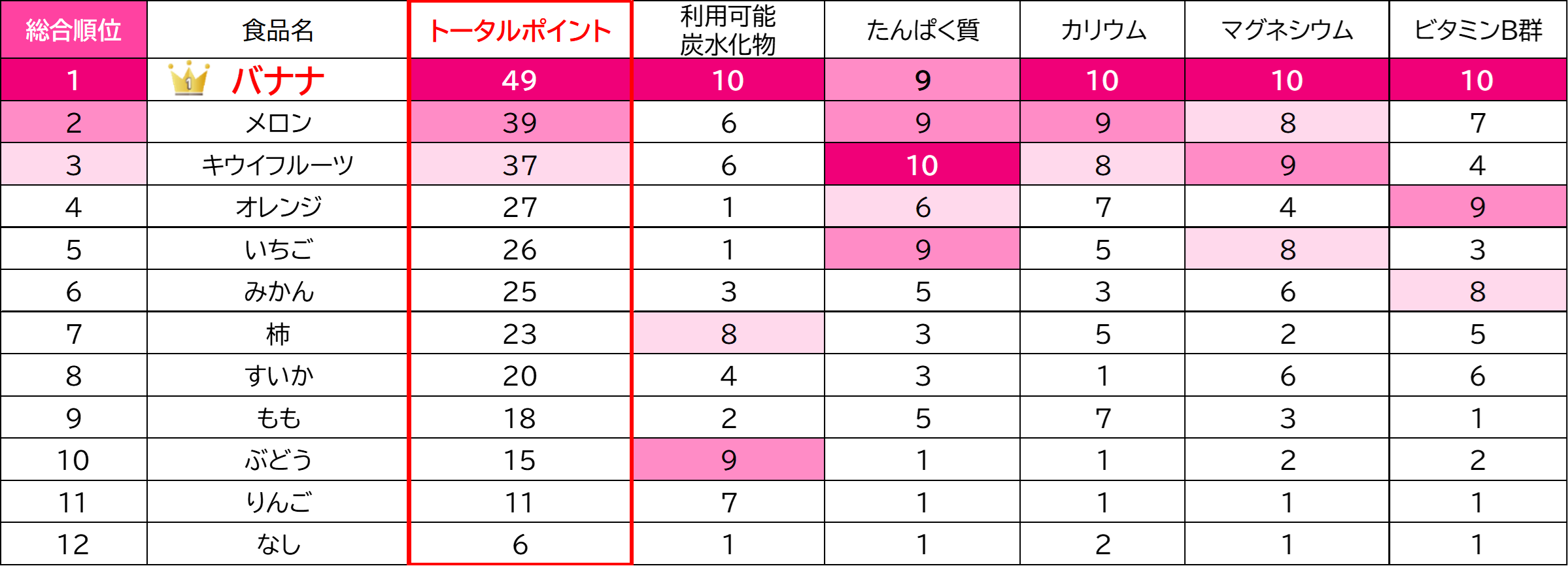 その結果、12品目のフルーツのうち「バナナ」がトータル49ポイントとなり、2位以下に10ポイントの差をつけてのトップとなりました。今回の調査で対象とした5栄養素のうち「たんぱく質」以外は全て1位(たんぱく質は同率2位)となる、堂々たる結果となりました。