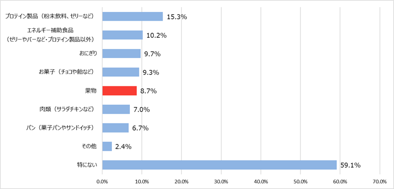 調査によると、週に1回以上の日常的な運動をしていると回答した方が51.7%と過半数に上りました(図1)。またその方々に運動をしている時に補給する食品を尋ねたところ、「特にない」と回答した方が6割近くに上った一方、「果物」と回答した方は8.7%に留まる結果となりました(図2)。