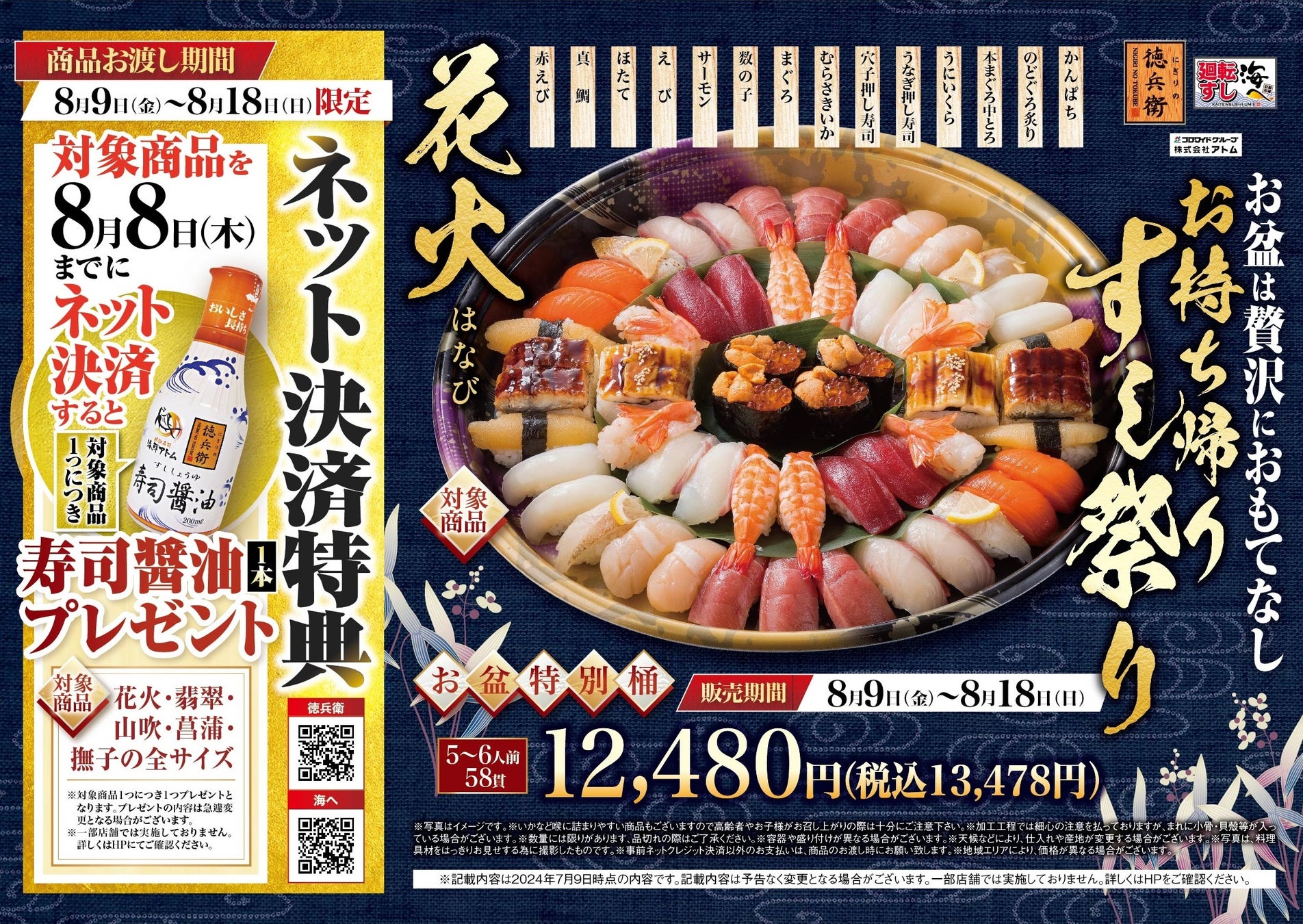 「にぎりの徳兵衛」「海鮮アトム」「海へ」の各店で、お盆限定桶「花火(はなび)」のご予約を承り中です。「花火」はお盆のおもてなしにぴったりの、本まぐろ中とろ、のどぐろ炙り、かんぱちなどの豪華ネタ満載で、お盆の楽しいひと時を豪華なお寿司が華やかに食卓を彩ります。