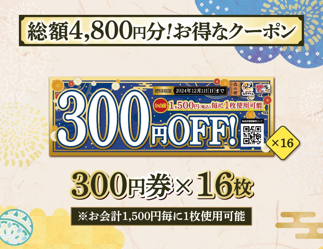 ・300円券はお会計税込1,500円毎に1枚ご利用可能です。