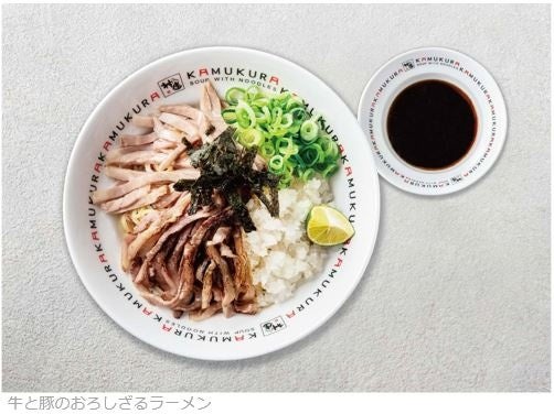 『牛と豚のおろしざるラーメン』と『豚のおろしざるラーメン』は、国産牛を低温調理して柔らかく仕上げたチャーシューを細切りにし、軽く炙って風味豊かに仕上げました。