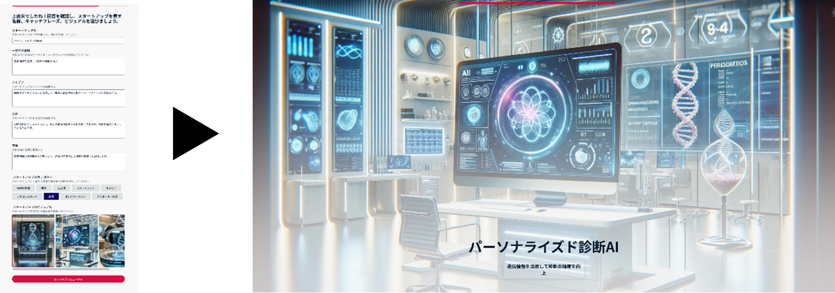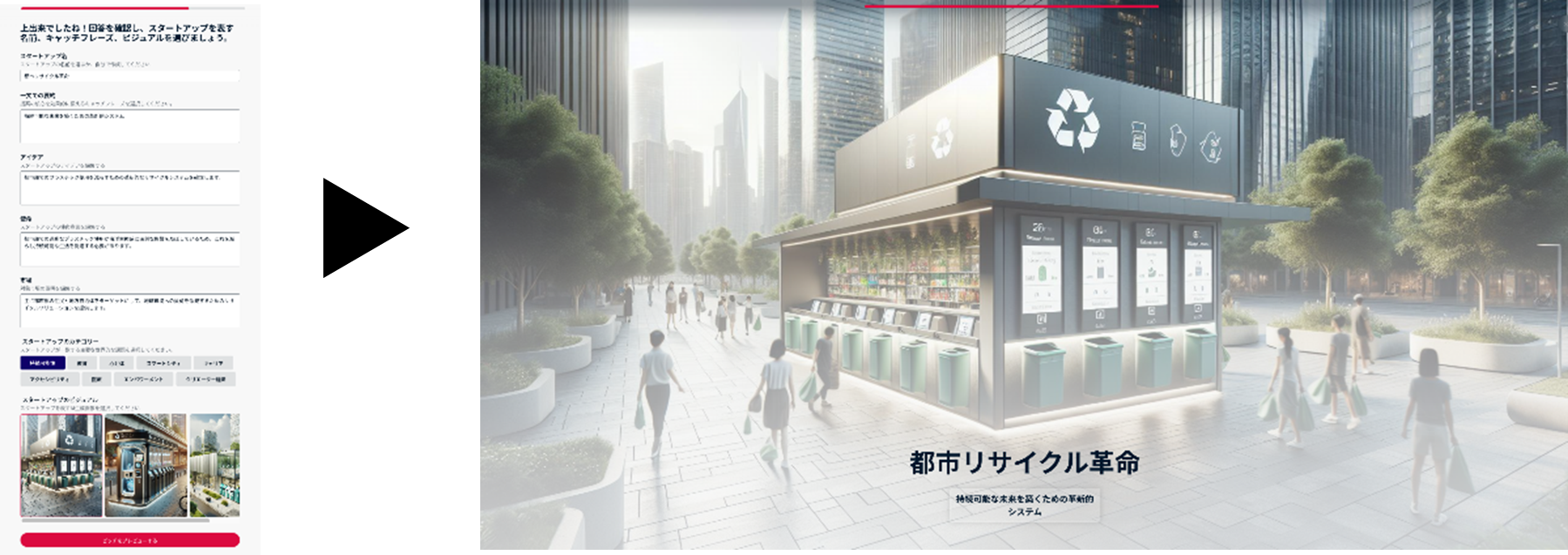AIを活用した応募フォームの入力画面と、作成されるビジネスプランのイメージ