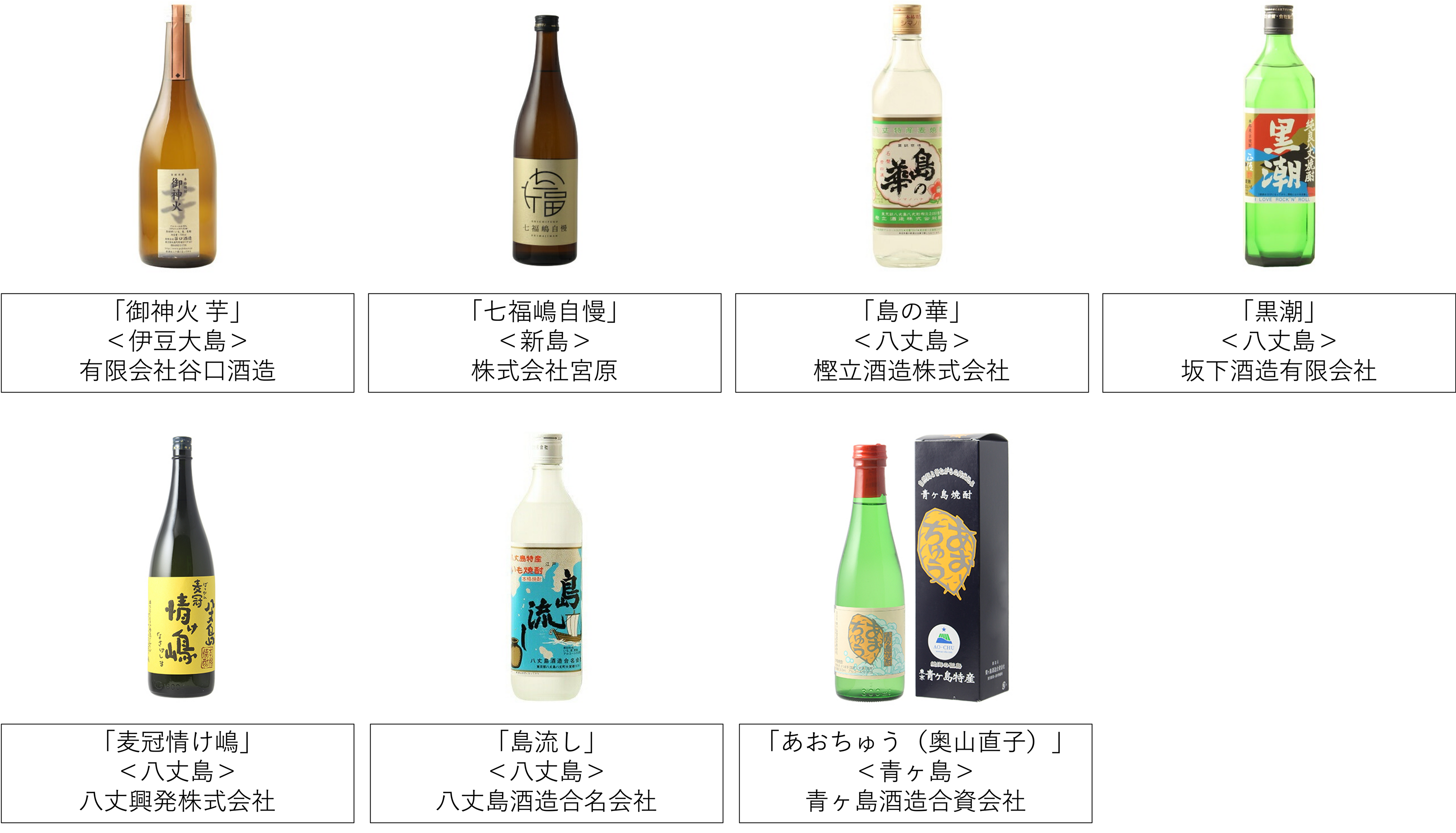 有限会社谷口酒造、株式会社宮原、樫立酒造株式会社、坂下酒造有限会社、八丈興発株式会社、八丈島酒造合名会社、青ヶ島酒造合資会社