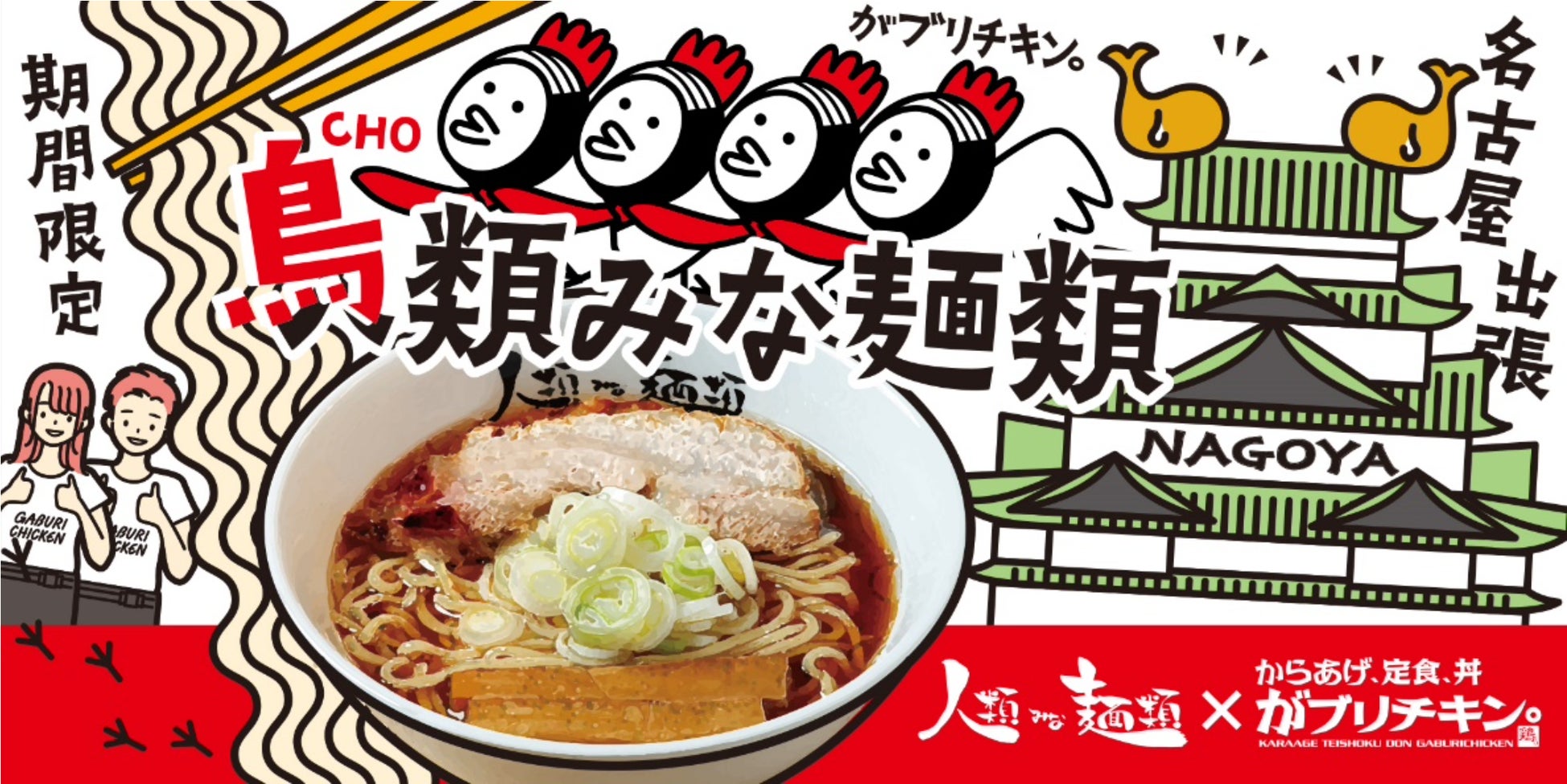 ⼤阪⾏列No.1ラーメン店「⼈類みな麺類(⼤阪・南⽅)」を運営するUNCHI株式会社(本社:⼤阪市淀川区、代表取締役:松村貴⼤)は、株式会社ブルームダイニングサービス(所在地:名古屋市中村区、代表取締役:杉村明紀)が運営する飲食ブランド「がブリチキン。」とコラボレーションし、「人類みな麺類」の人気商品「らーめん原点SPACE」を、7月30日(火)より順次、レストラン/フードコート業態「からあげ、定食、丼 がブリチキン。」にて期間限定販売いたします。