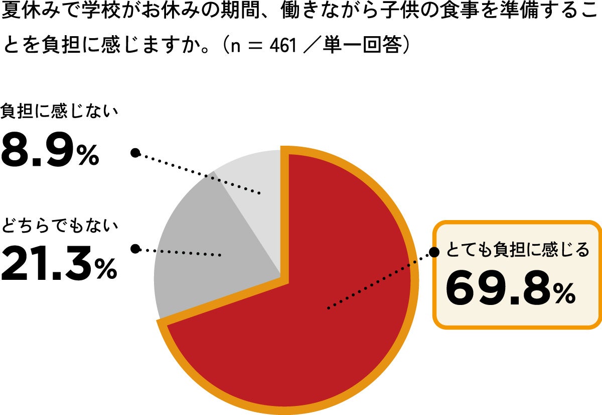 「夏休みで学校がお休みの期間、働きながら子どもの食事を準備することを負担に感じるかどうか」聞いたところ、「とても負担に感じる」と回答した人は69.8%となり、7割近くが夏休み期間中の食事準備を負担に感じていることがわかりました。