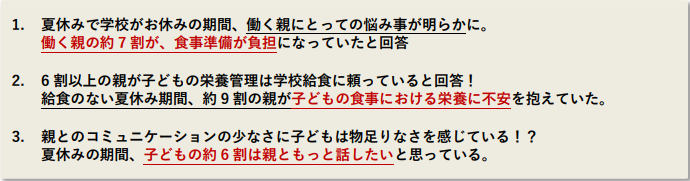 給食のない夏休み期間、約9割の親が子どもの食事における栄養に不安を抱えていた。