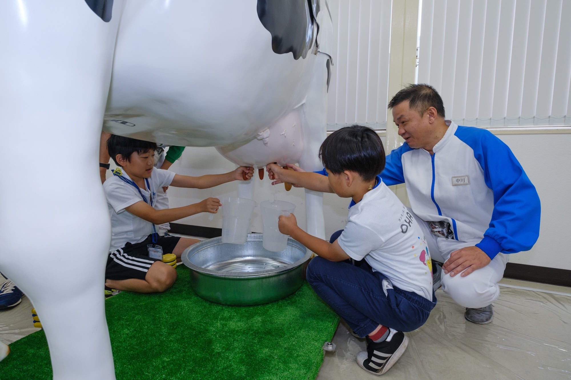 牛の模型を使った搾乳体験