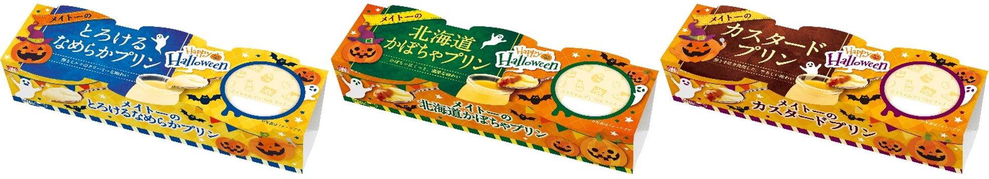 さらに、9月9日から10月下旬までの期間限定で、3個入りパッケージの「メイトーの北海道かぼちゃプリン」「メイトーのとろけるなめらかプリン」「メイトーのカスタードプリン」からハロウィンパッケージも登場いたします。