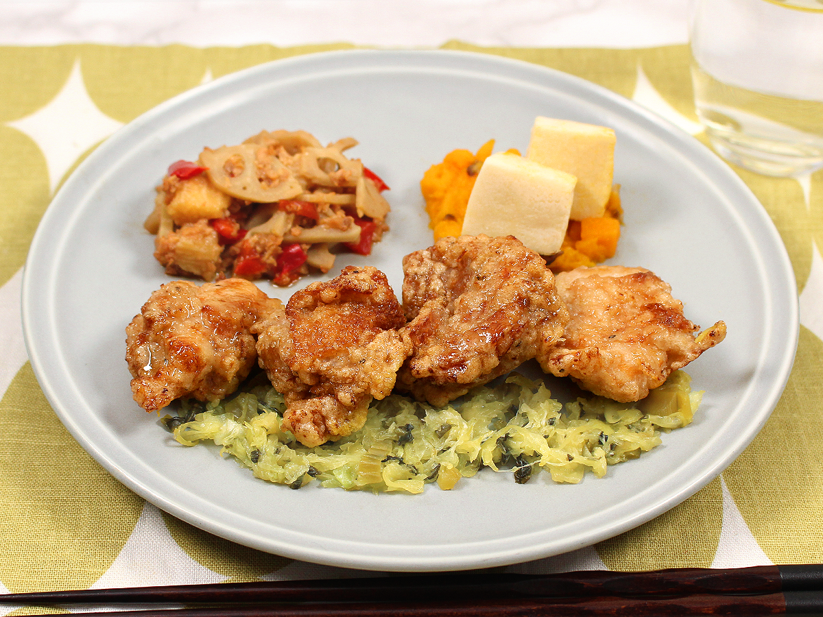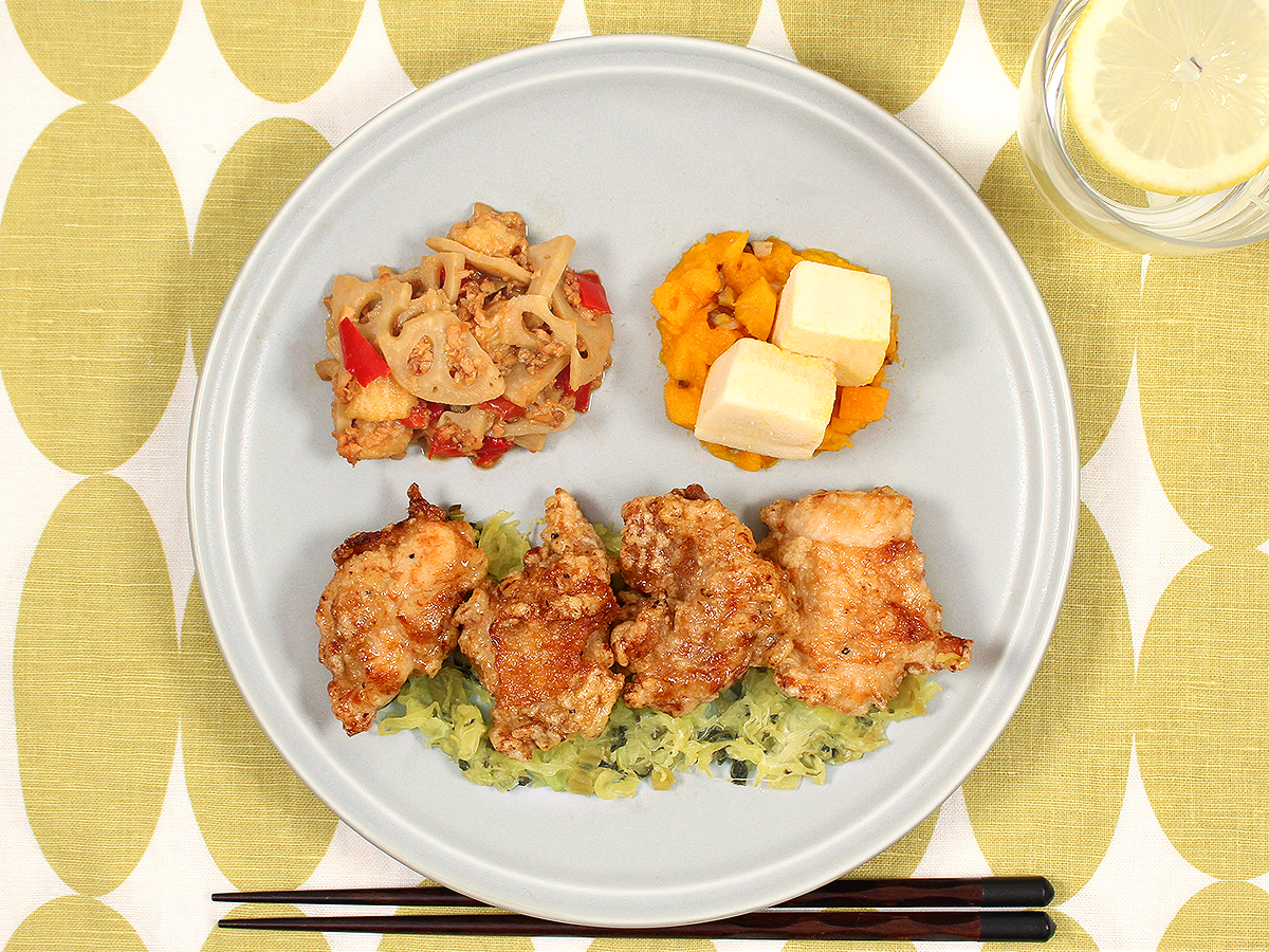 人気のにんにく醤油から揚げの味はそのままに、よりから揚げにマッチする添え野菜と副菜をご用意しました!添え野菜のキャベツは高菜を混ぜることで、そのままでも美味しく召し上がっていただけます。 副菜は、蓮根のそぼろあえ、お出汁風味のかぼちゃのあえものと高野豆腐です。