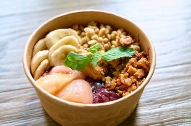 ベースのアサイーに自然由来のピーナッツバターやハワイ産のビックアイランドハニーで優しい甘さを加え、キャラメリゼしたマカダミアナッツで香ばしさとサクサクとした食感をプラス。おからのクランブル、旬の果物のコンポートとバナナ、ミントを加え、色鮮やかに仕上げました。