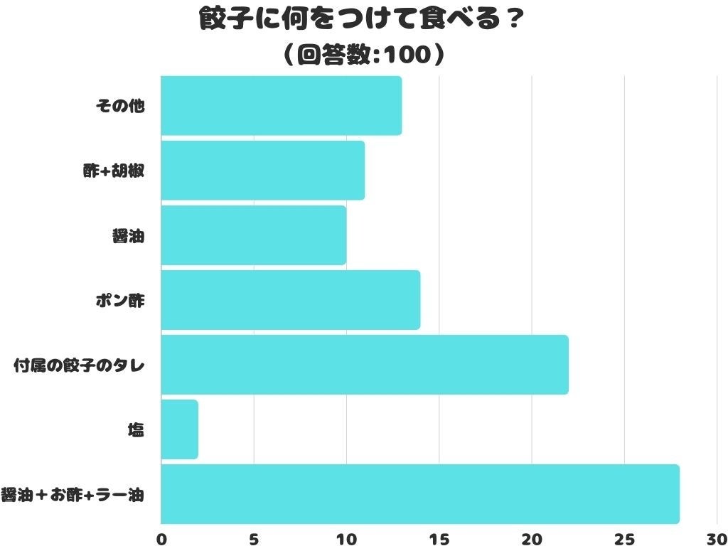 「餃子に何をつけて食べる」をアンケートにて調査したところ、1位は「醤油+お酢+ラー油」でした。