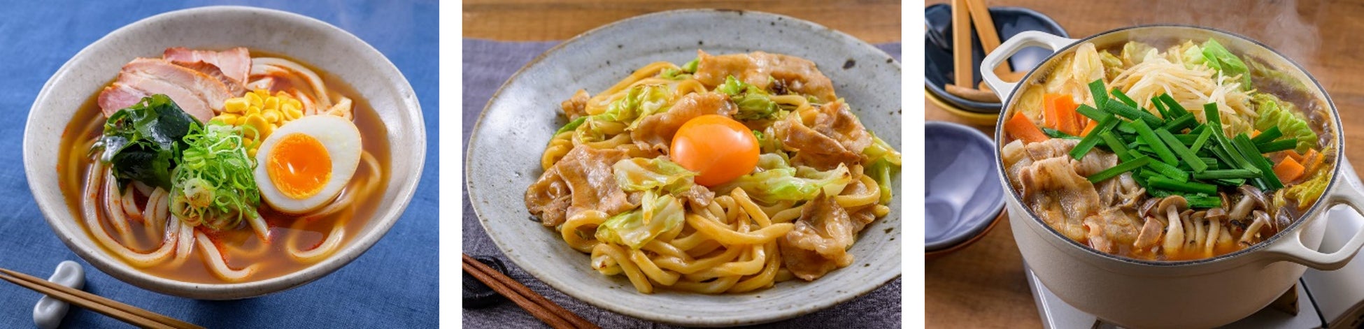 おすすめのメニューは、豚肉、キャベツ、茹でたうどんと一緒に「麺と鍋。コク旨やみつき味噌」を炒めて作る「味噌焼うどん」です。甘辛い味噌がうどんに染み込んでやみつきのおいしさです。今回発売する「麺と鍋。コク旨やみつき味噌」は、様々な食材で使いやすい調味料となっておりますので、是非冷蔵庫の中の色々な食材に合わせて、「いつものメニューも大変身!」させてみてください。