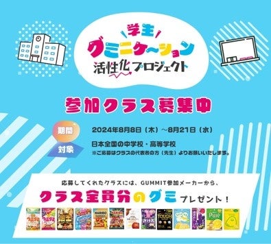 UHA味覚糖株式会社(本社:大阪市中央区、代表取締役:山田泰正)が参加するGUMMITは、日本グミ協会とともに9月3日グミの日に向けて、新学期を迎える学生の間のコミュニケーションを活性化させる「学生グミニケーション活性化プロジェクト」を2024年8月8日(木)より始動いたします。本プロジェクト始動にともない、全国の中学・高校を対象に、GUMMIT参加メーカー6社のグミを配布する「クラスでレッツ!グミニケーション おひさしグミセットプレゼントキャンペーン」の応募を開始いたします。