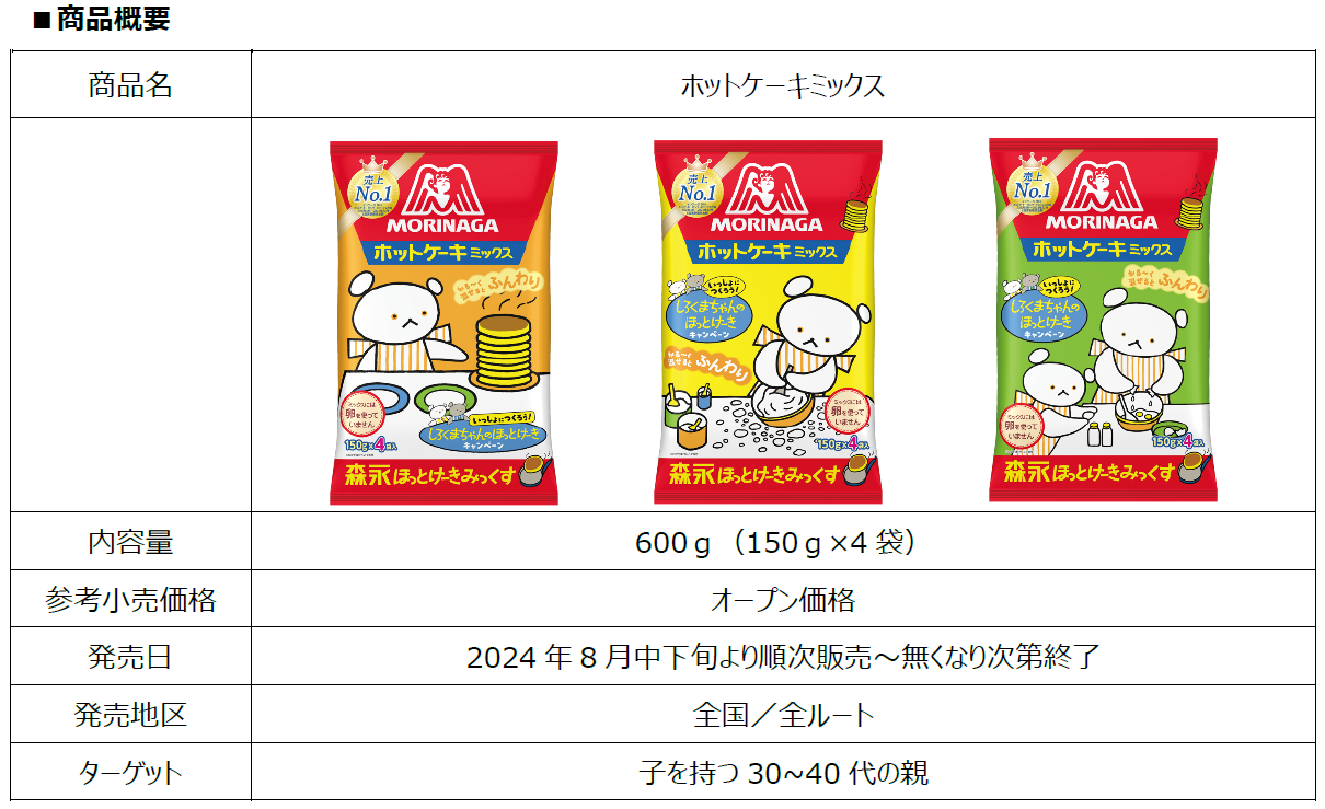 どなたでも混ぜやすくふんわりと焼き上がり、くちどけが良いのでおいしくて食べやすい「森永ホットケーキミックス」と、『しろくまちゃんのほっとけーき』で描かれている“自分で作る楽しさ”や“喜びを分かち合うこと”を体験することで、絵本の世界が現実になるようなひと時をもっと味わっていただきたいという思いにより今年もコラボレーションを実施いたします。