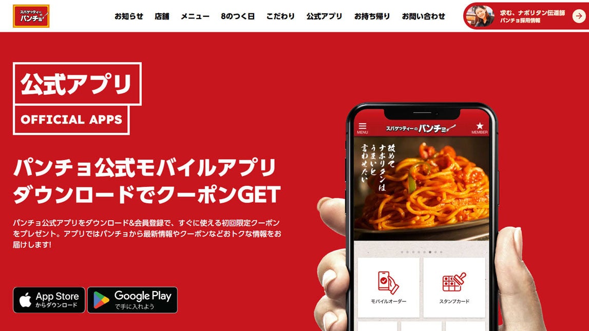 スパゲッティーのパンチョ 公式アプリは、最新情報やスタンプカード、モバイルオーダー(対象店舗のみ)などナポリストに便利な機能が満載。しかも、初回ダウンロード/会員登録時&定期的にクーポン配布中!