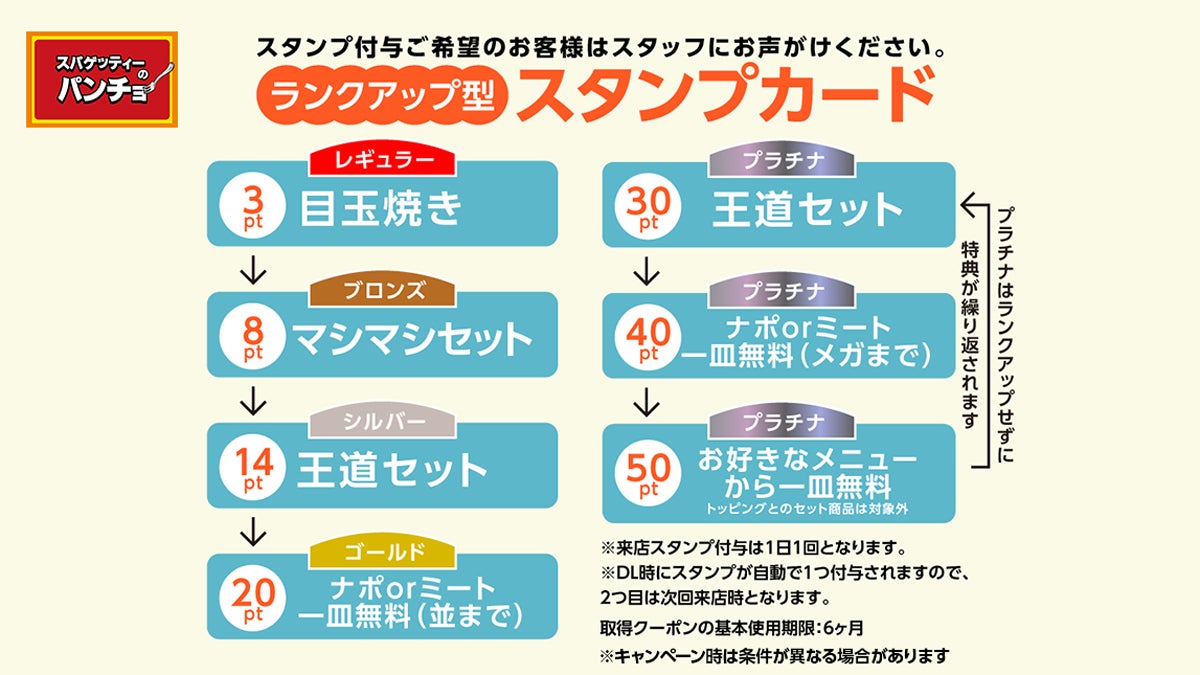 期間中は毎日、パンチョ公式アプリ内の来店ポイントを2倍進呈します。来店ポイントが貯まるとトッピングなどのクーポンをプレゼント、そしてポイントクリアのたびに会員ステージがどんどん上がってクーポン内容もどんどん豪華にレベルアップします。