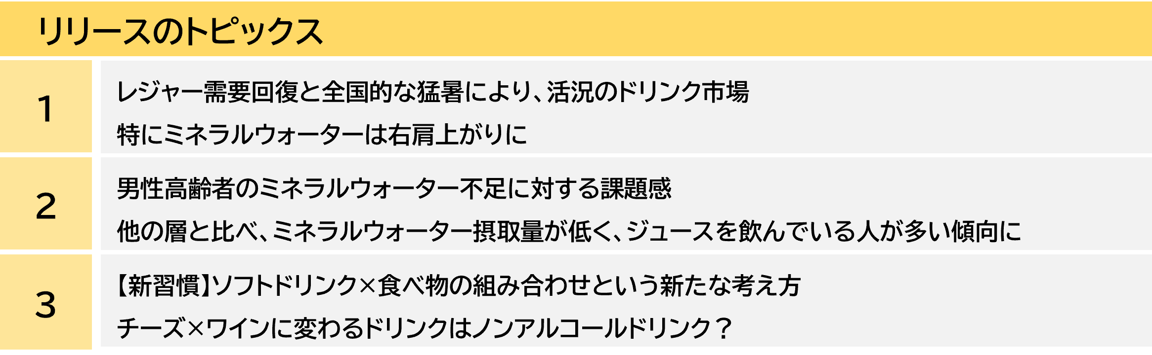 ミネラルウォーター類の需要は拡大し続けており、コロナ禍が落ち着いたことによるレジャーの回復と全国的な猛暑も後押しして、市場拡大が継続的に見られます。