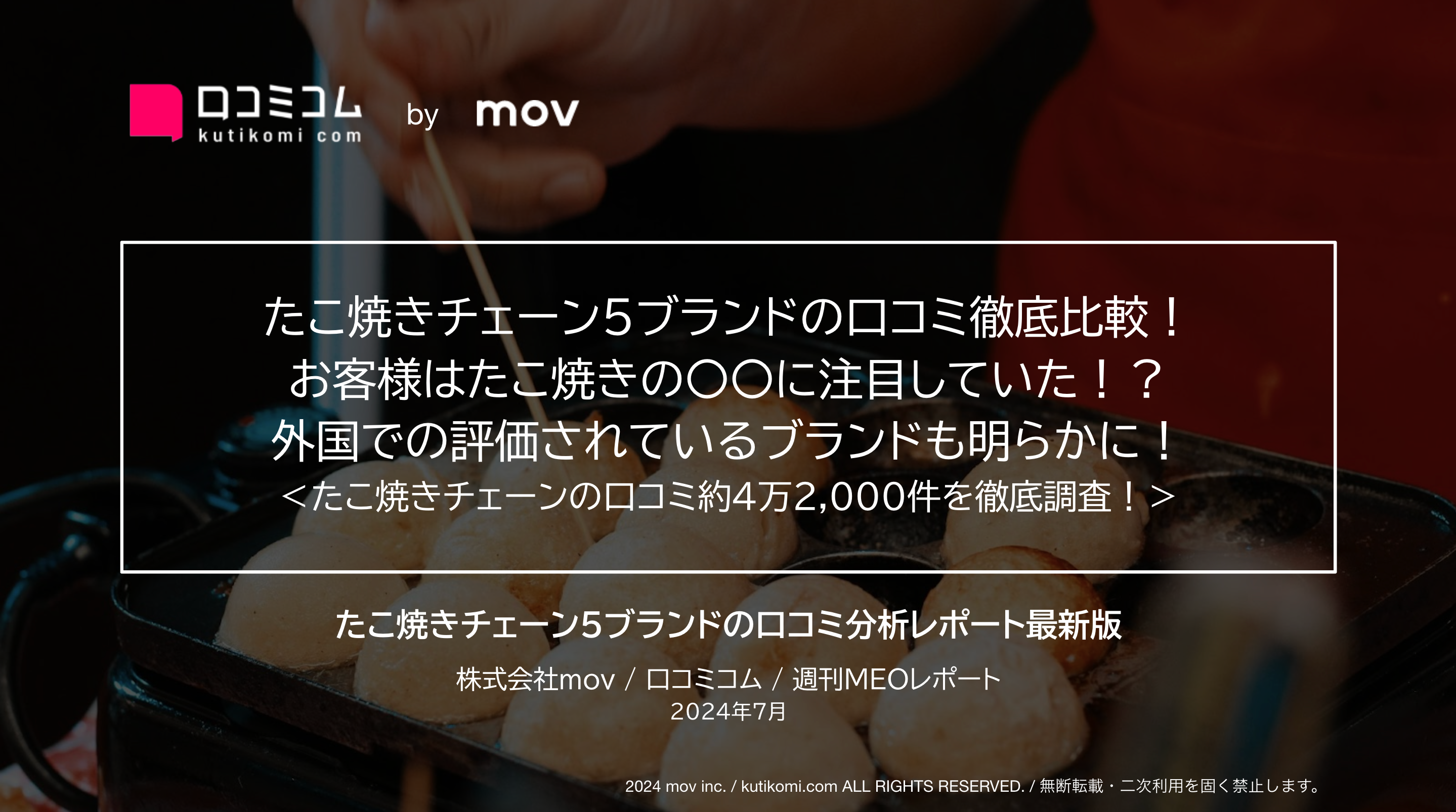 今回は、たこ焼きチェーン5ブランドに寄せられた約4万2,000件の口コミを調査、比較検証をしました。