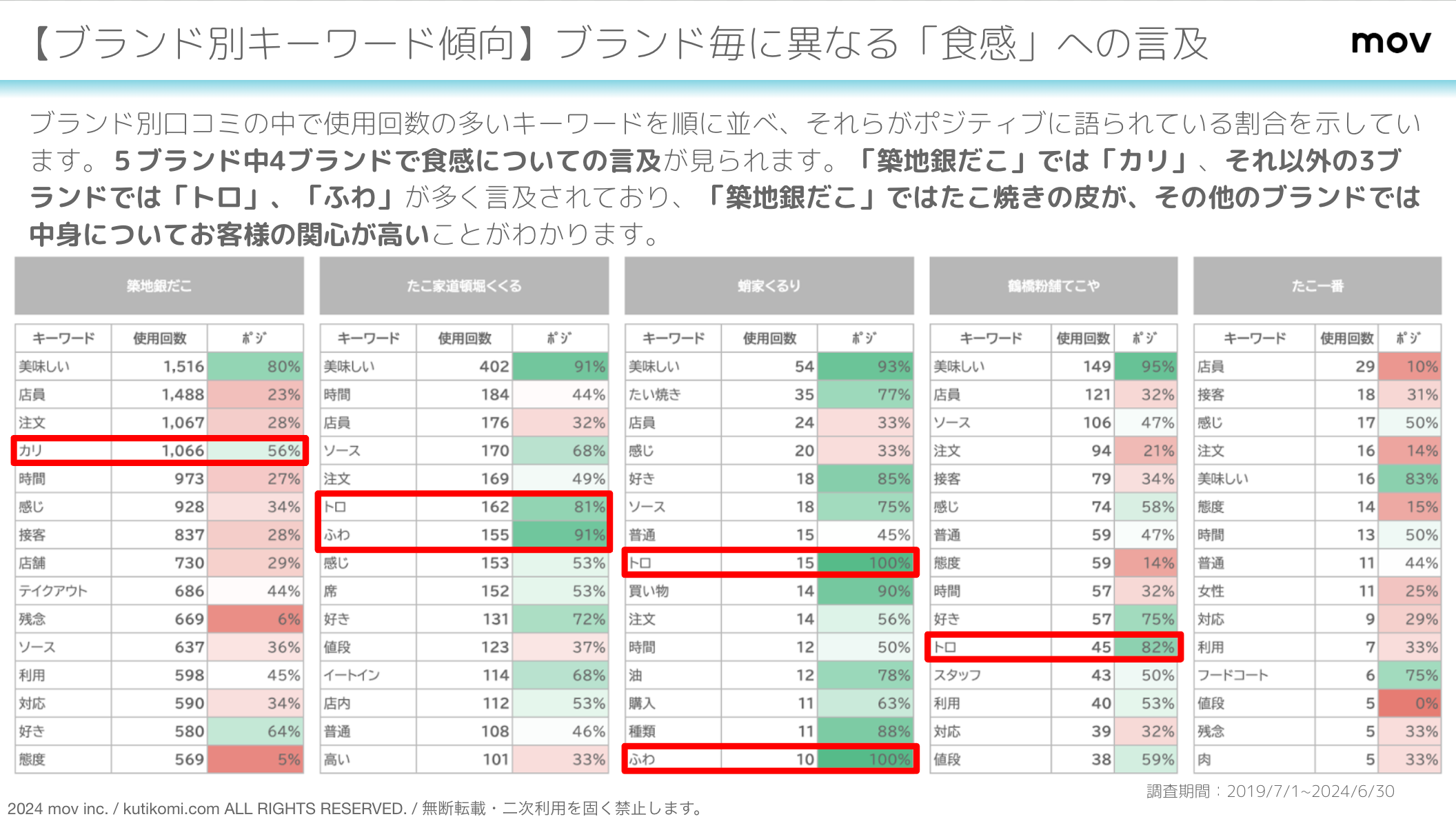 ブランド別口コミの中で使用回数の多いキーワードを順に並べると、5ブランド中4ブランドで食感についての言及が見られます。「築地銀だこ」では「カリ」、それ以外の3ブランドでは「トロ」、「ふわ」が多く言及されており、「築地銀だこ」ではたこ焼きの皮が、その他のブランドでは中身についてお客様の関心が高いことがわかります。