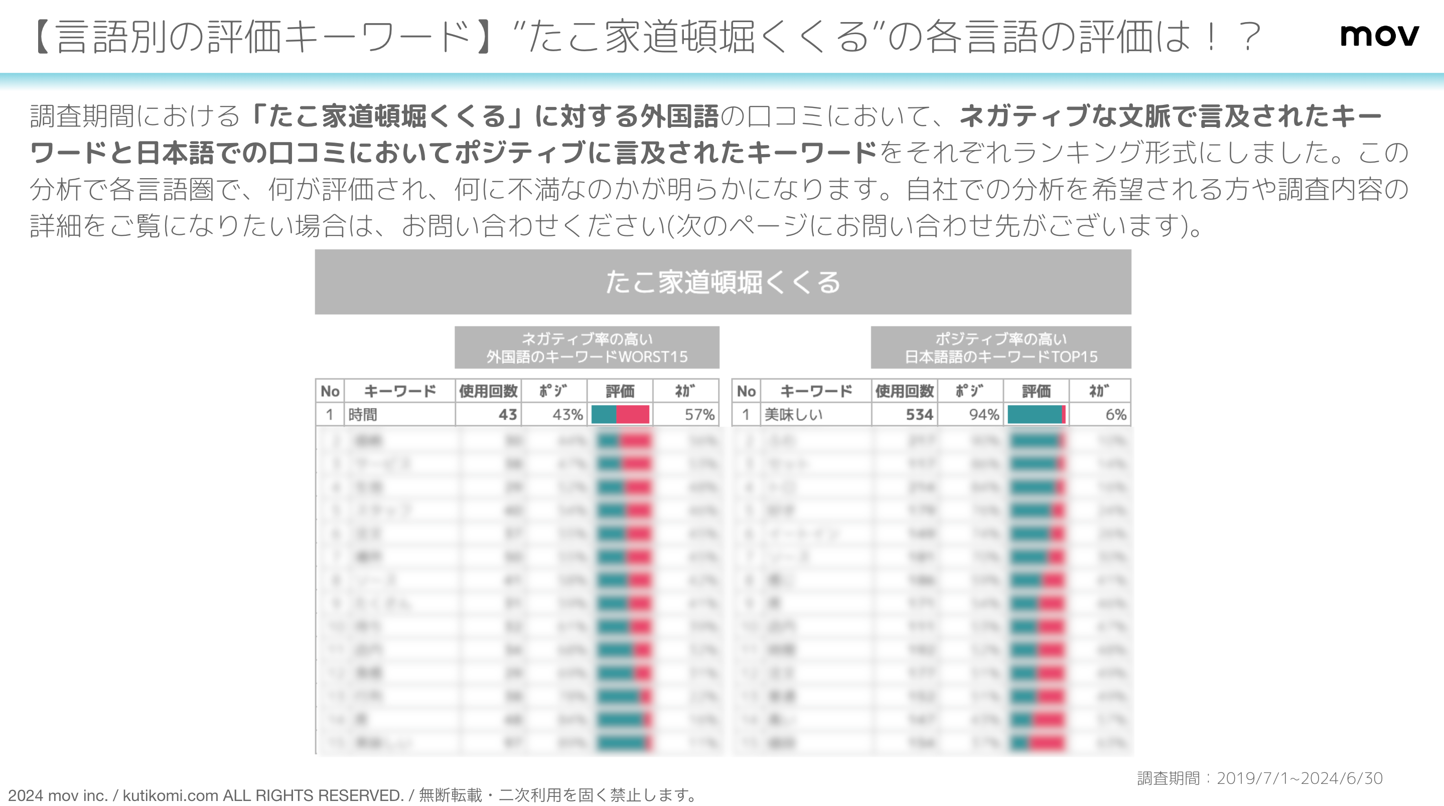 調査期間における「たこ家道頓堀くくる」に対する外国語の口コミにおいて、ネガティブな文脈で言及されたキーワードと日本語での口コミにおいてポジティブに言及されたキーワードをそれぞれランキング形式にしました。