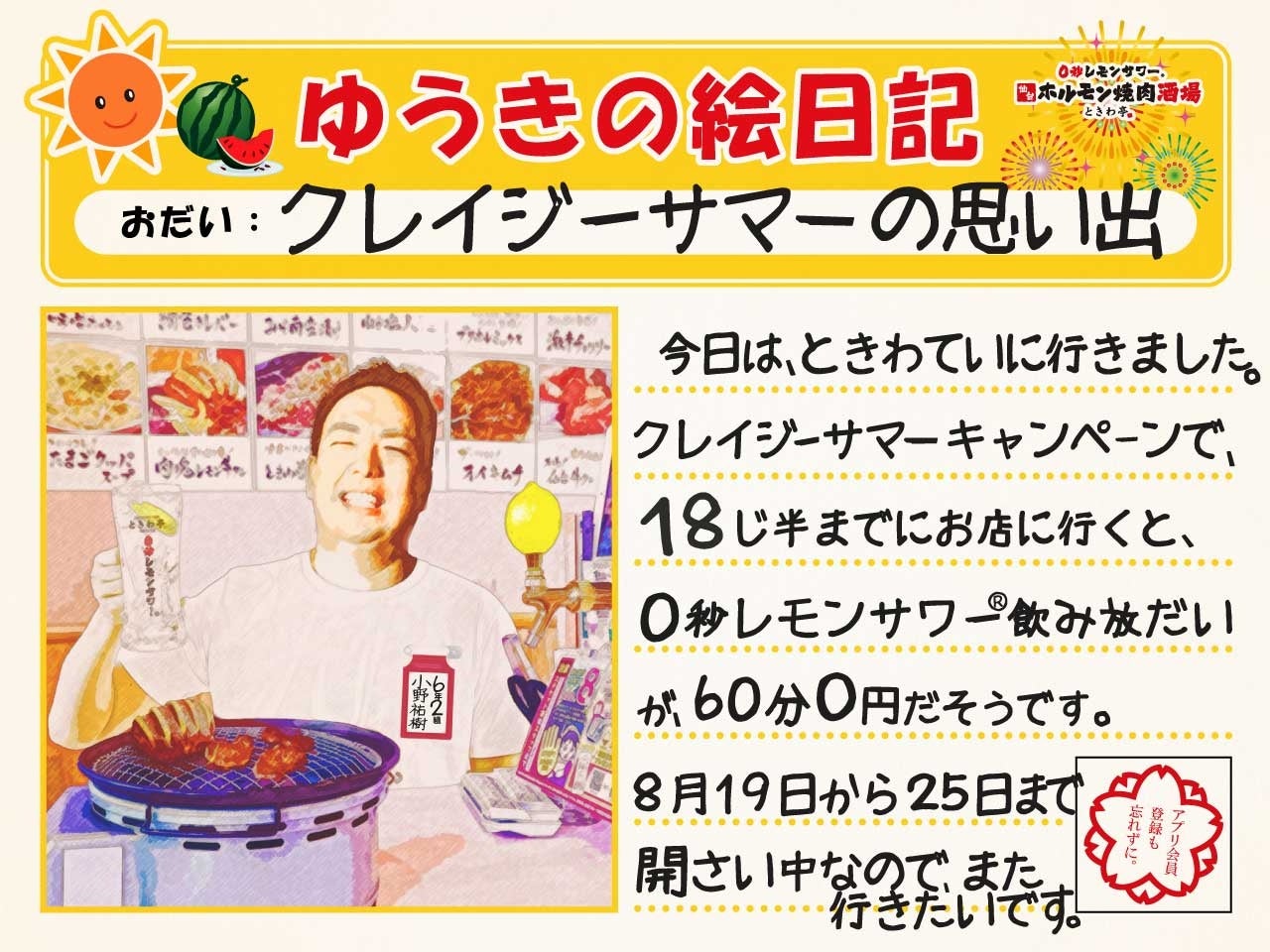 この度、小学生の頃の楽しかった夏休みを思い出していただきたいと、毎年好評の『クレイジーサマー2024』キャンペーンを開催します。8月19日(月)から8月25日(日)までの7日間限定で、「ときわ亭公式アプリ」会員の方で、対象店舗に18時30分までに来店いただくと、通常550円(税込)の「0秒レモンサワー」60分飲み放題を無料で提供します。夏の終わりに、長くて楽しかった夏休みの思い出を振り返りながら、「0秒レモンサワー」をお楽しみいただけます。