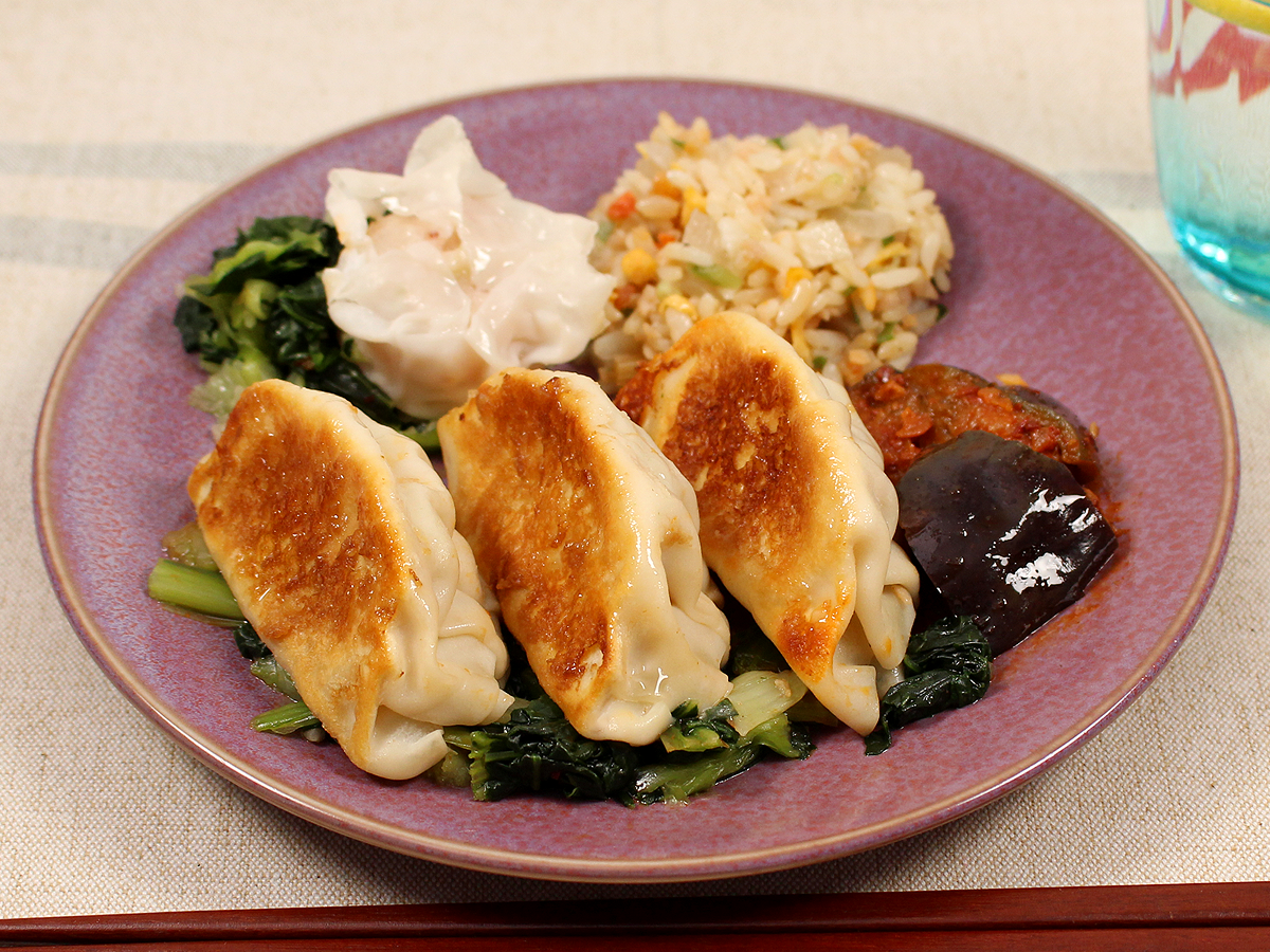 焼き餃子の美味しさはそのままに、海鮮焼売、焼きめし入りでボリュームアップ!人気の中華のメニューを詰め込んだよくばりなプレートの登場です!焼き餃子は一般的な餃子より糖質を35%カット(*1)しているのにもちっとした仕上がりになっております。 副菜は、海鮮焼売とにんにく青菜、焼きめしです。 *1 日本食品標準成分表(八訂) 調理済み流通食品類/ぎょうざ参照