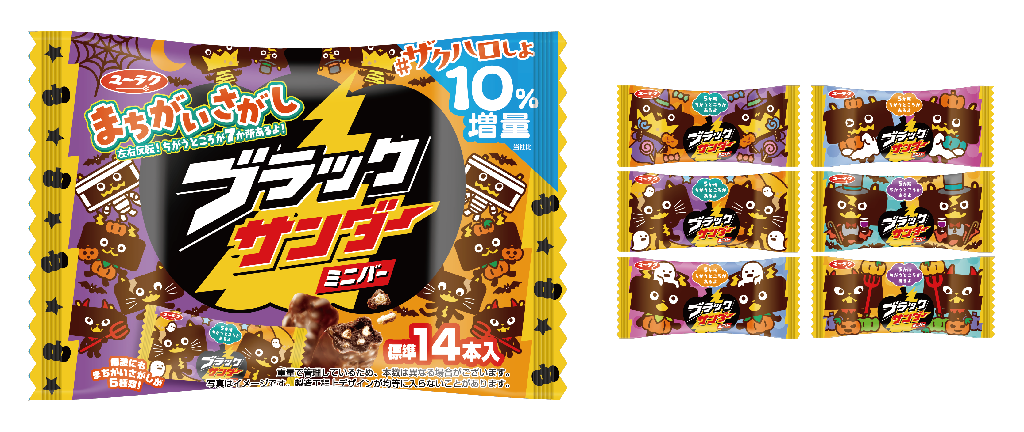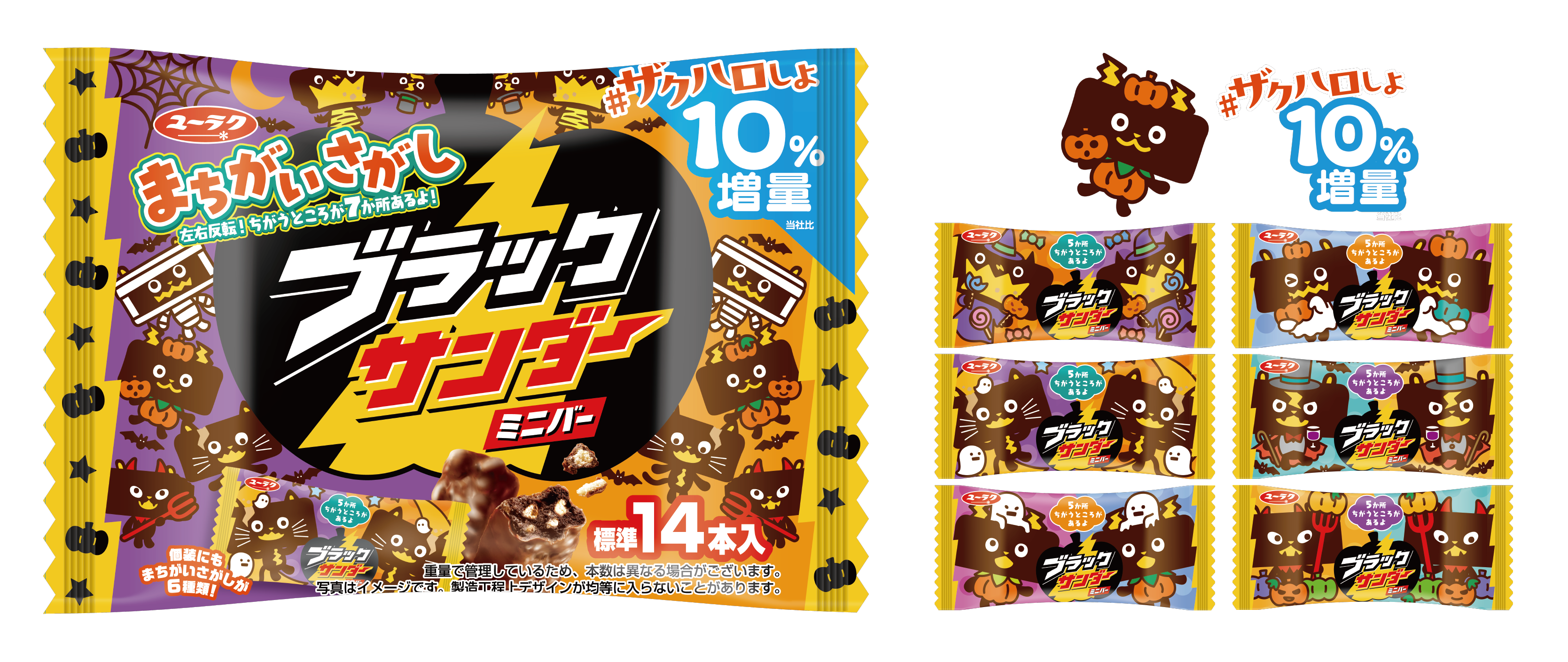 パッケージには、ブラックサンダーをモチーフにした大好評のキャラクターが今年も登場。よりハロウィンをお楽しみいただけるよう、外装に1種類、個包装には6種類(※1)全7種類の「まちがいさがし」が付いています。また、ブラックサンダーの圧倒的ザクザク感でハロウィンを盛り上げたいとの思いで「#ザクハロしよ」のコピーを採用しています。お楽しみが詰まったハロウィン仕様のブラックサンダーミニバーで楽しいハロウィンをお過ごしください。