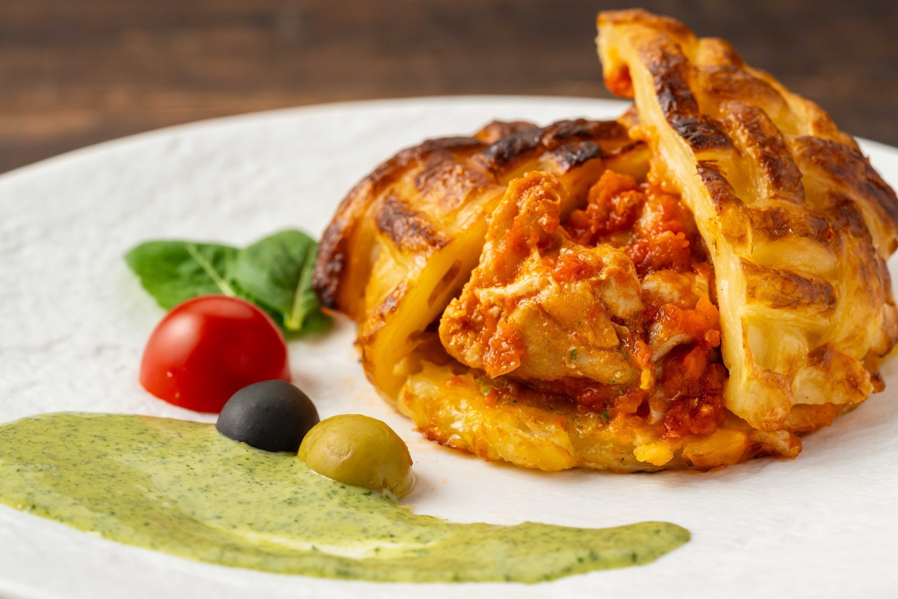 ■チキントマト煮とジャーマンポテトのパイ包み焼き(店舗:YEBISU BAR 京都ヨドバシ店)