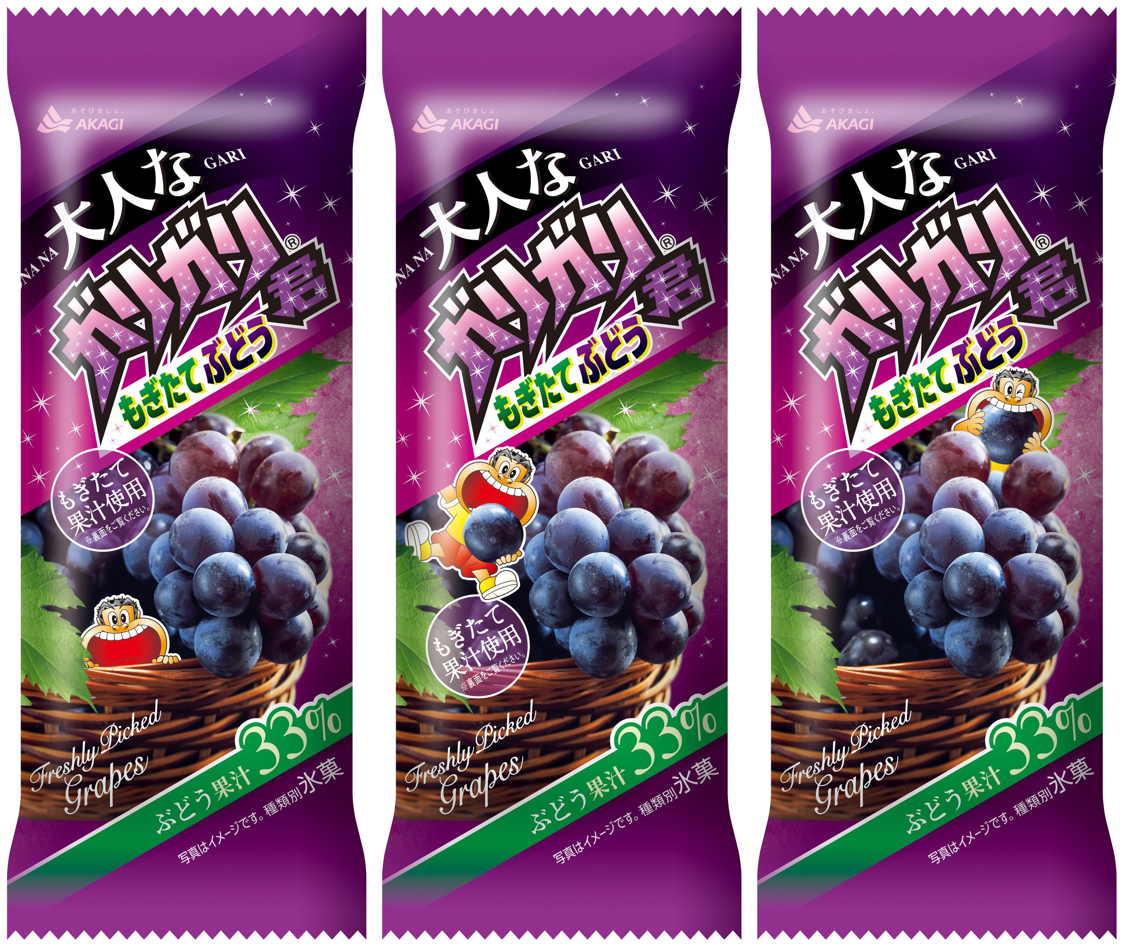 「大人なガリガリ君もぎたてぶどう」は、ぶどうアイスの中に、ジューシーなぶどうかき氷を入れたアイスキャンディーです。収穫して24時間以内に搾汁した、ジューシーなぶどう果汁のみを33%使用しました。ぶどうの豊かな味わい、美味しさをお楽しみください。