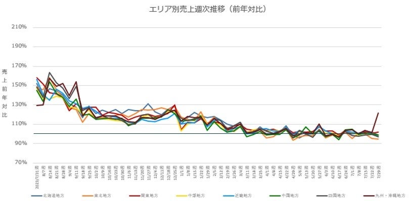 7月売上、前年対比の伸長率(地方平均)は100.5%と前月から0.7pt増加した。各地域の売り上げについては、東北地方が最も低く前年対比97.2%となった。