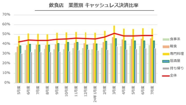 業態別で見ると、キャッシュレス決済利用は、1位の専門料理が50.8%で前月より0.3pt増加した。