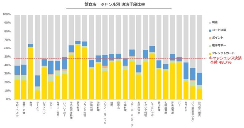 ジャンル別に見ると、寿司・その他西洋料理・鉄板料理・フランス料理・しゃぶしゃぶでキャッシュレス比率が60%を超える。また、コード決済比率が高いサラダ店とカレーでは、その比率が15%を超える。