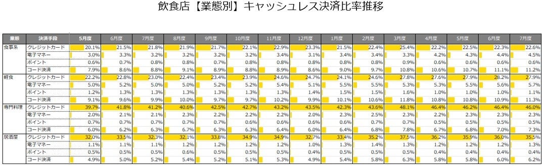 ・キャッシュレス決済手段別では、6月度から7月度で比較すると、すべての業態でコード決済比率が増加した。