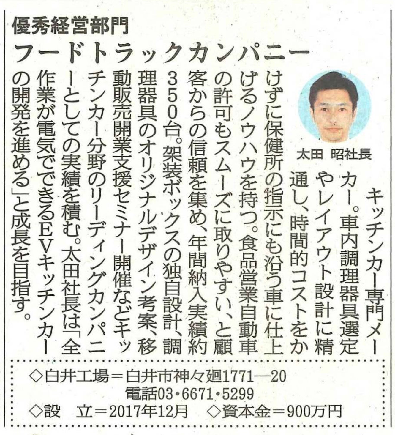 記事内にて弊社代表の太田がお答えしている通り、全作業を電気でできるEVキッチンカー開発などを通じて、フードトラックカンパニー社はさらなる成長を目指してまいります。